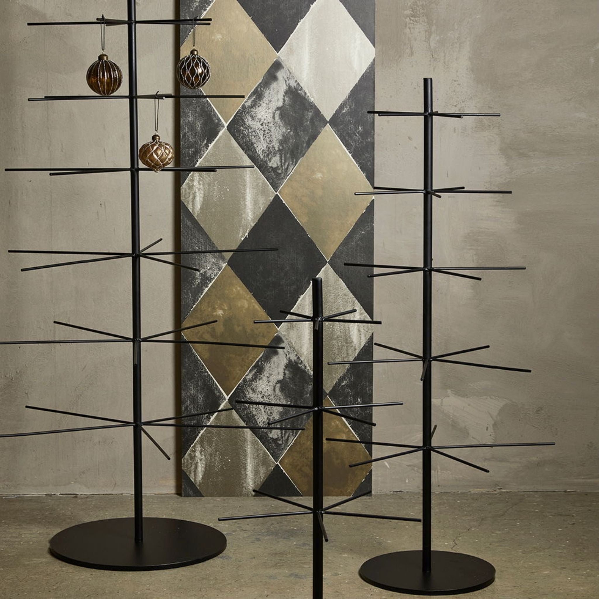 Dekorationstræet i sort metal er en stilfuld og moderne måde at vise julepynten frem på.