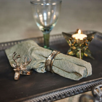Servietringen med hjort i antik guld er perfekt til julens borddækning. Den elegante detalje tilfører varme og glød, så middagen får et festligt og stemningsfuldt udtryk, der understreger julens magi.