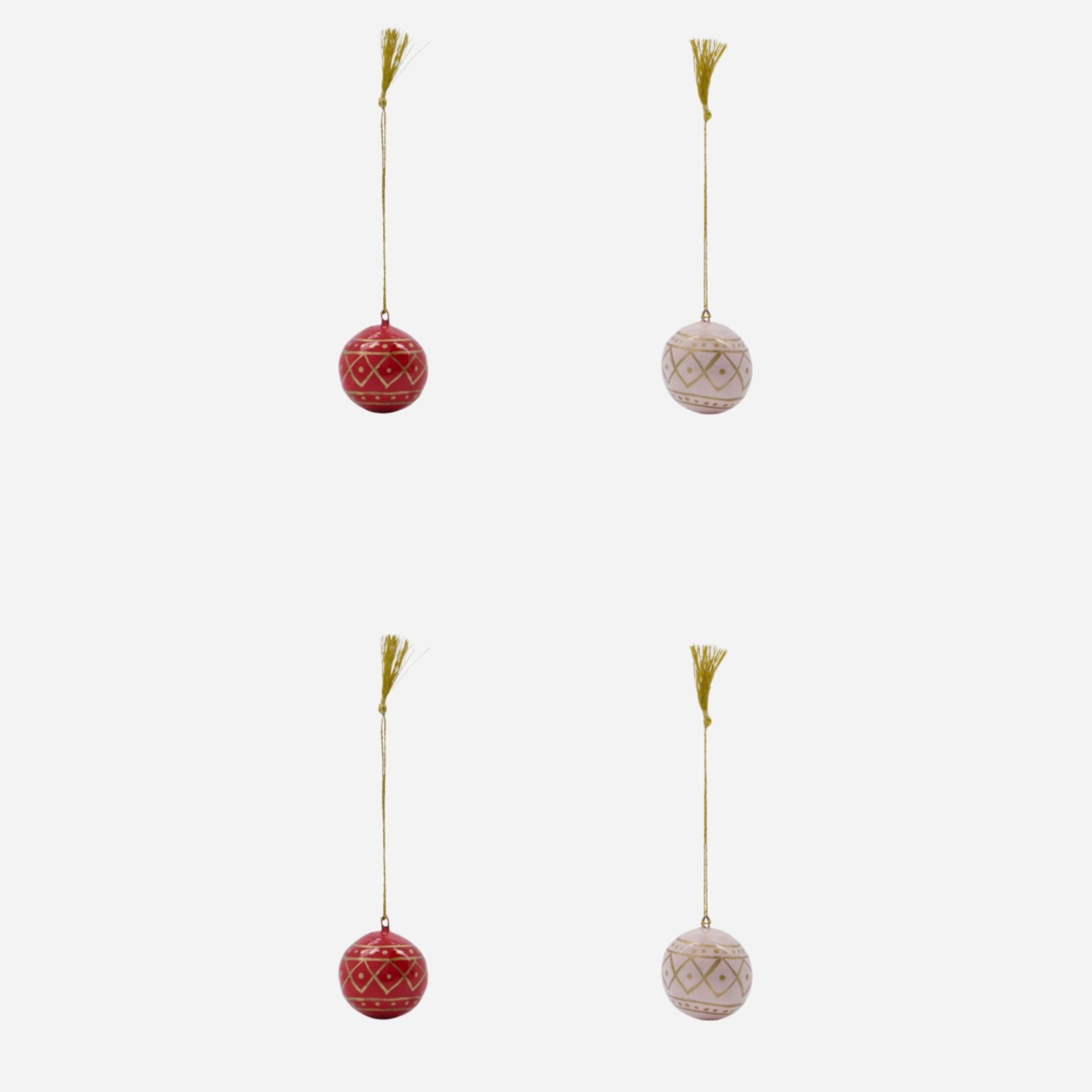 Sættet består af fire ornamenter i to forskellige designs i smukke rød- og rosatoner eller mørke- og mintgrøn.