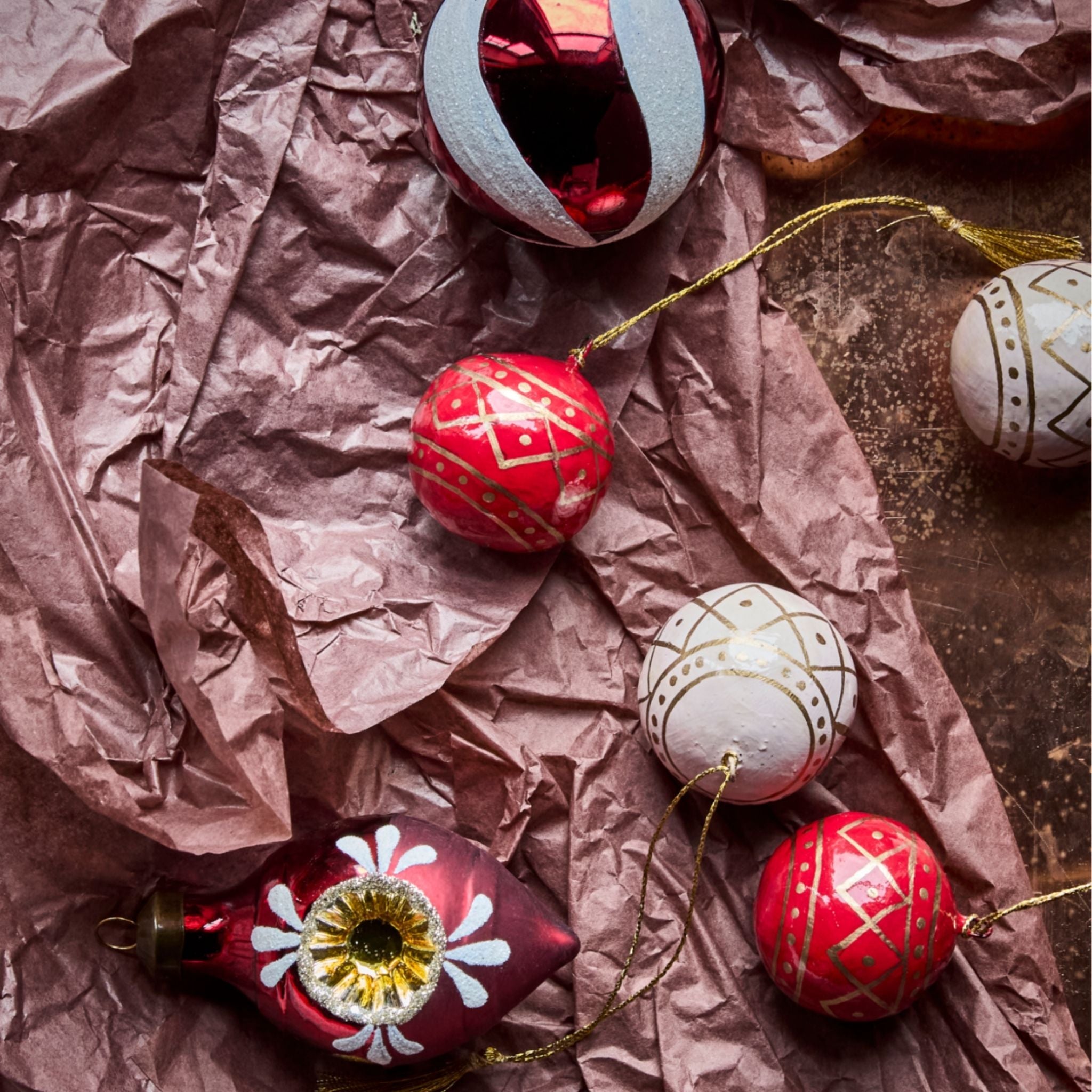 Tilføj en unik og festlig stemning til dit hjem med disse håndlavede ornamenter i papmaché.