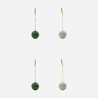 Hvert ornament er prydet med et håndmalet guldmønster, der tilfører elegance og et eksklusivt udtryk – perfekt til juletræet, borddækningen eller som små dekorationer rundt om i hjemmet.