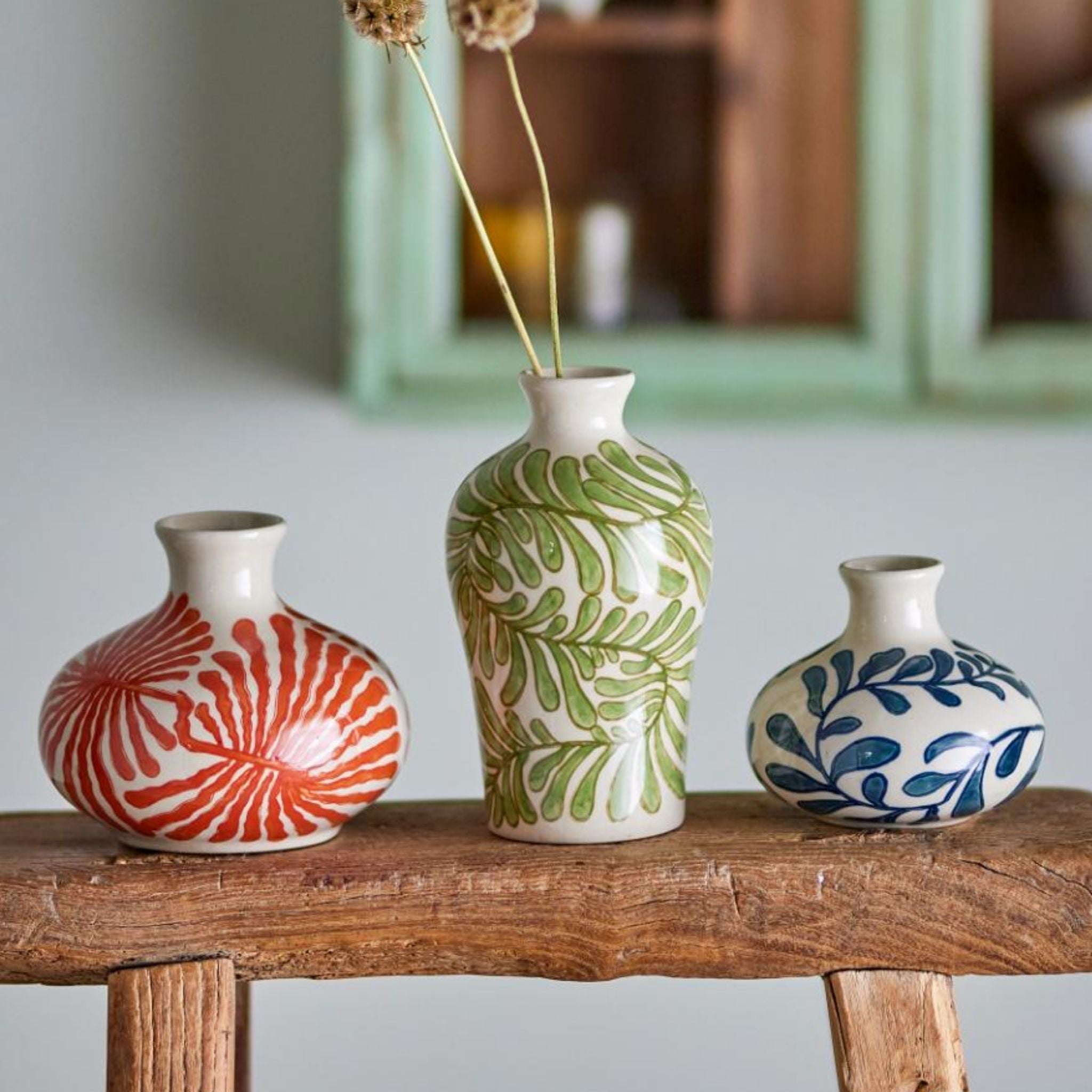 Vaserne er håndmalede med plantemotiver i tre forskellige fine farver; grøn, rød og blå.