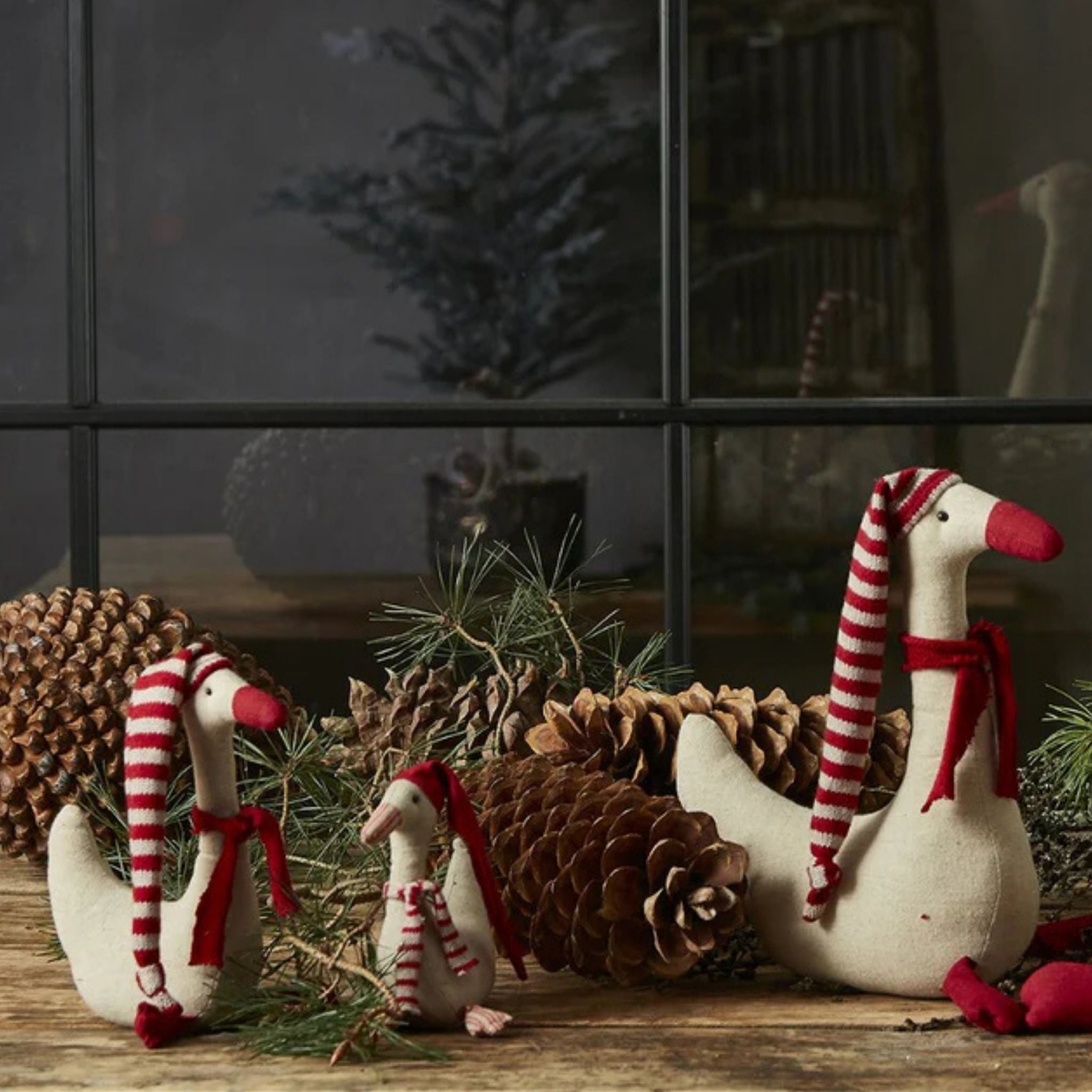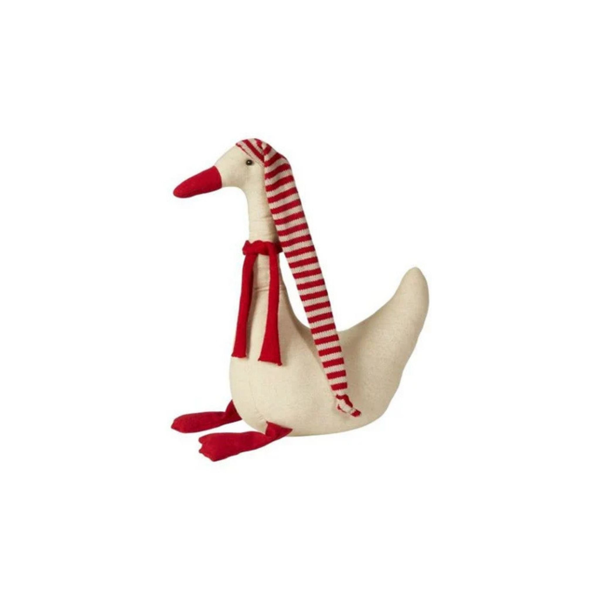 Skab julestemning med denne charmerende gås i stof iført rød stribet hue og et rødt tørklæde.