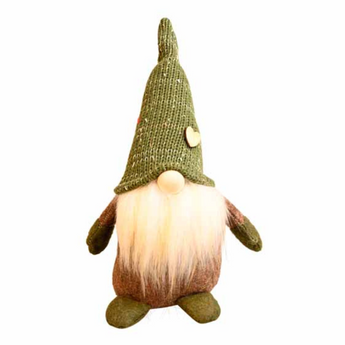 Sød nisse i grønlige farver med huen trukket helt med til næsen og stort hvidt skæg. Denne skønne nisse passer ind i den mere dæmpet og naturlige juleudsmykning.