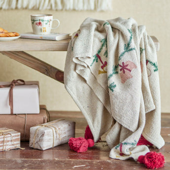 Gør vinteraftenerne ekstra hyggelige med denne juleplaid i genanvendt bomuld. Den bløde og varme plaid er dekoreret med et charmerende julemotiv, der spreder festlig stemning i hjemmet. Perfekt til at hygge under foran pejsen, på sofaen eller som et dekorativt element i stuen – et bæredygtigt valg, der kan nydes i mange sæsoner.