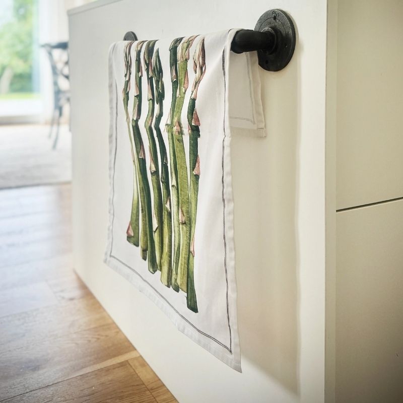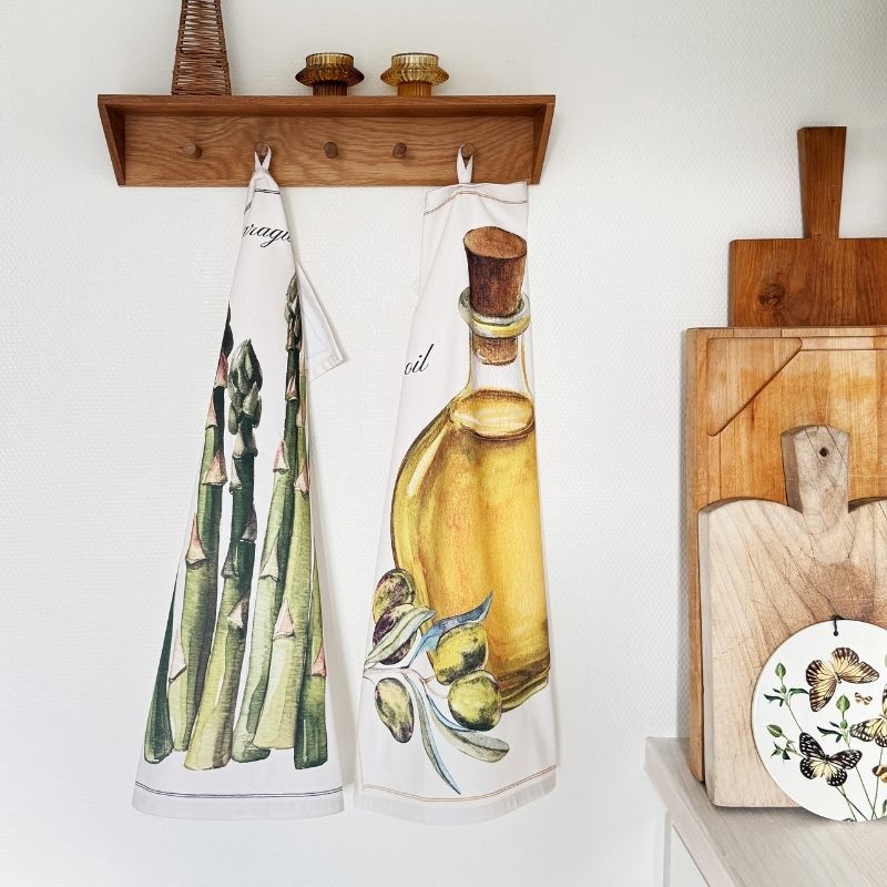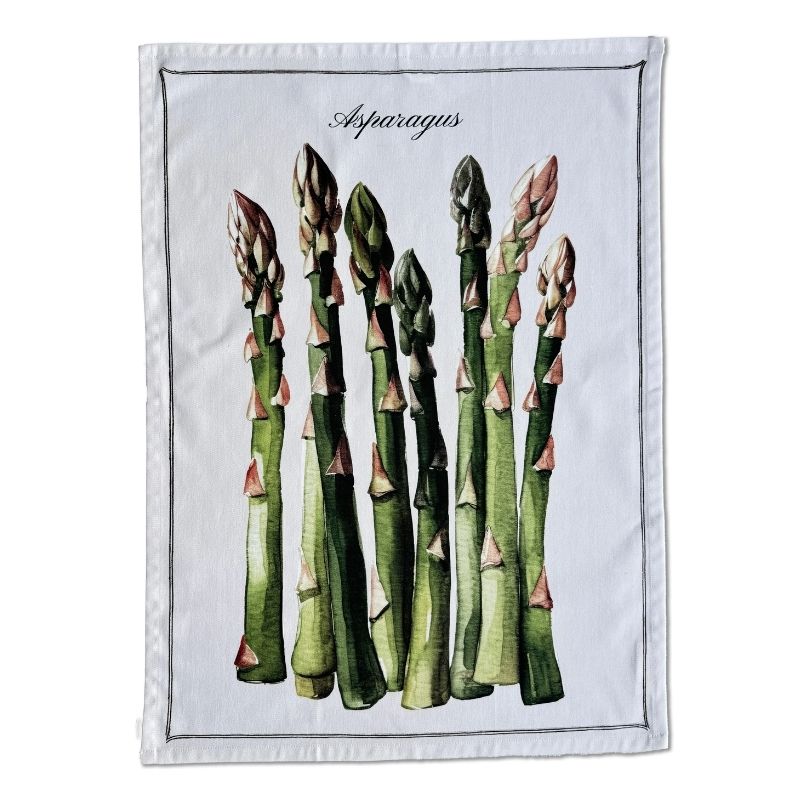 Viskestykket med aspargesmotiv er fremstillet af 100% bomuld i høj kvalitet og forener funktionalitet med et stilrent, botanisk udtryk. Det fine motiv af asparges tilføjer et friskt og naturligt element til køkkenet, mens bomulden sikrer høj sugeevne og lang levetid.