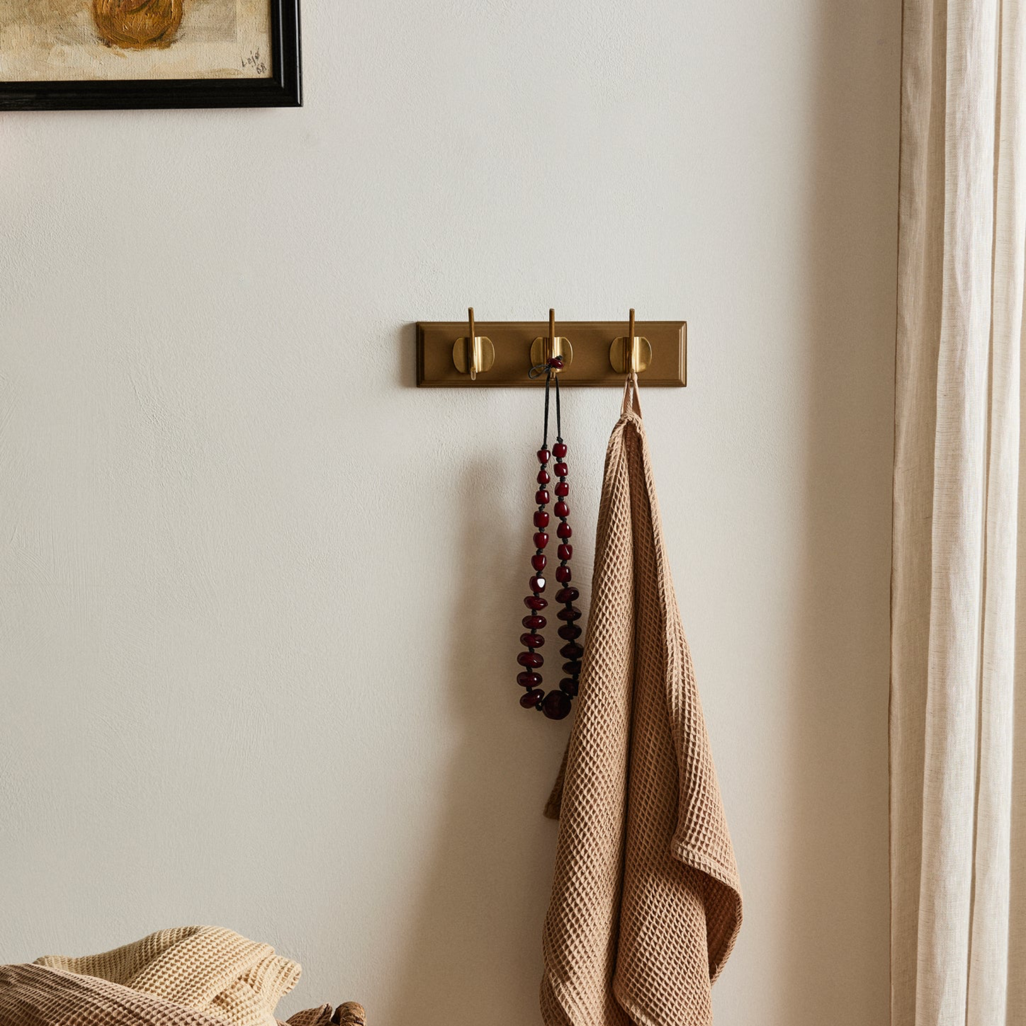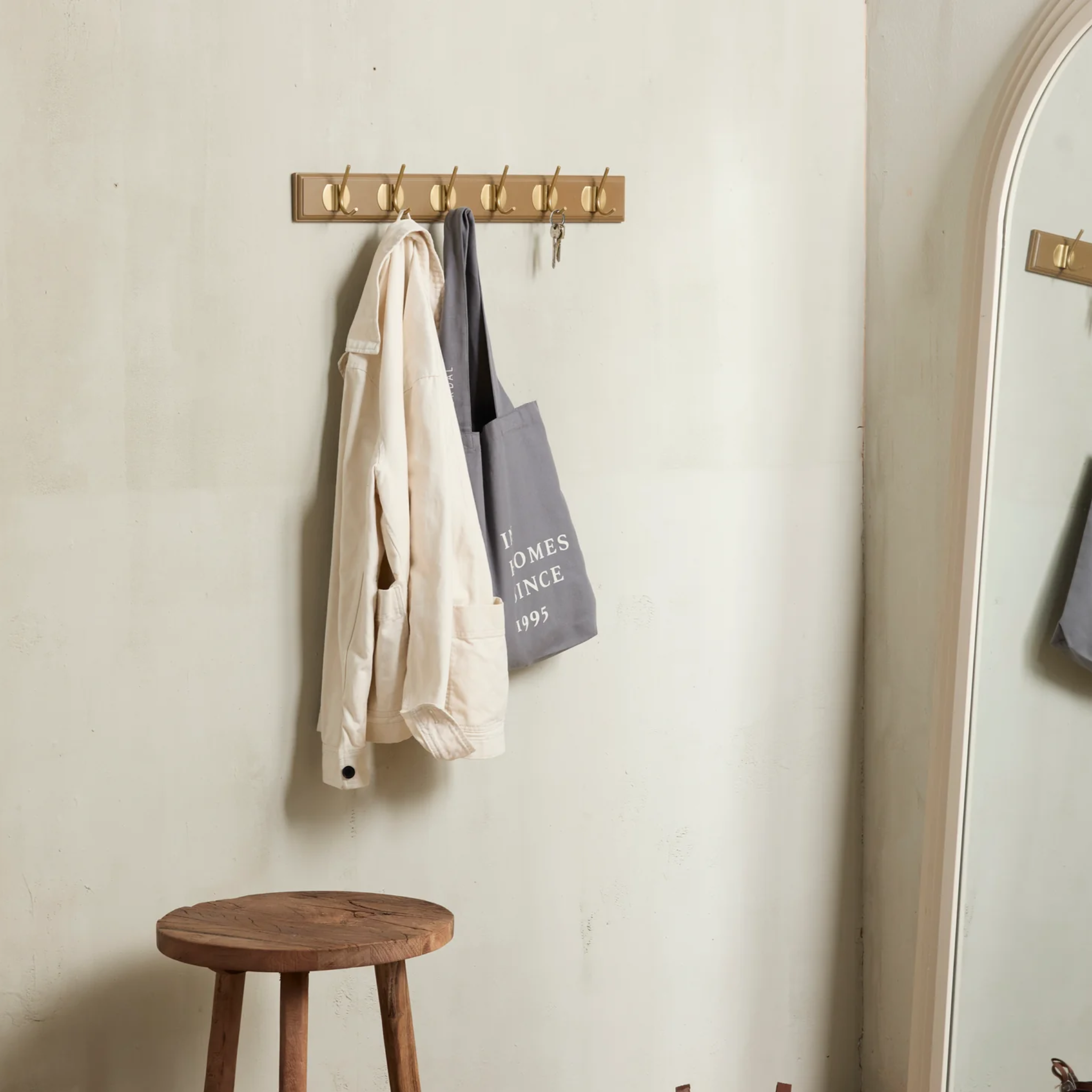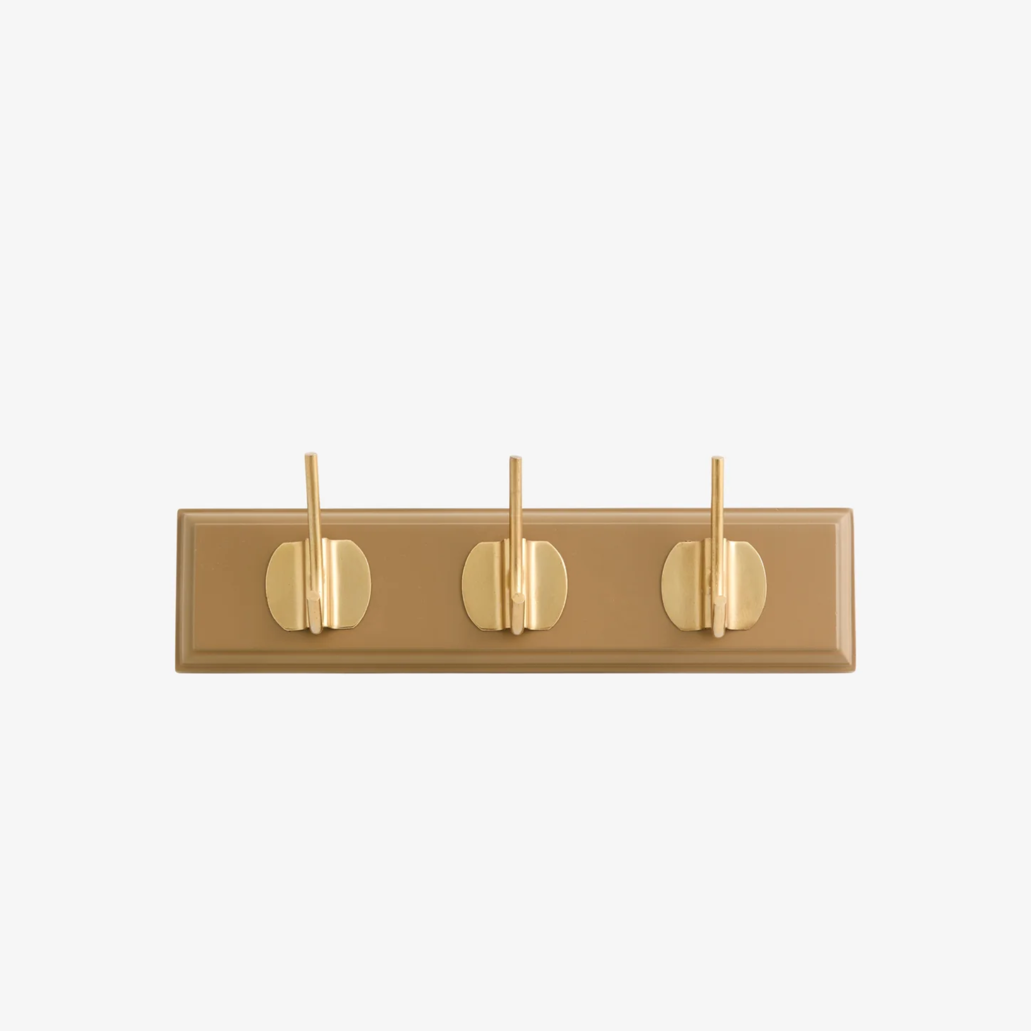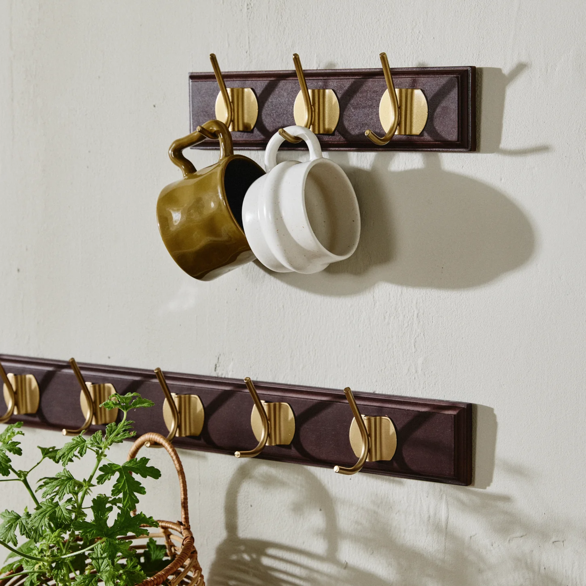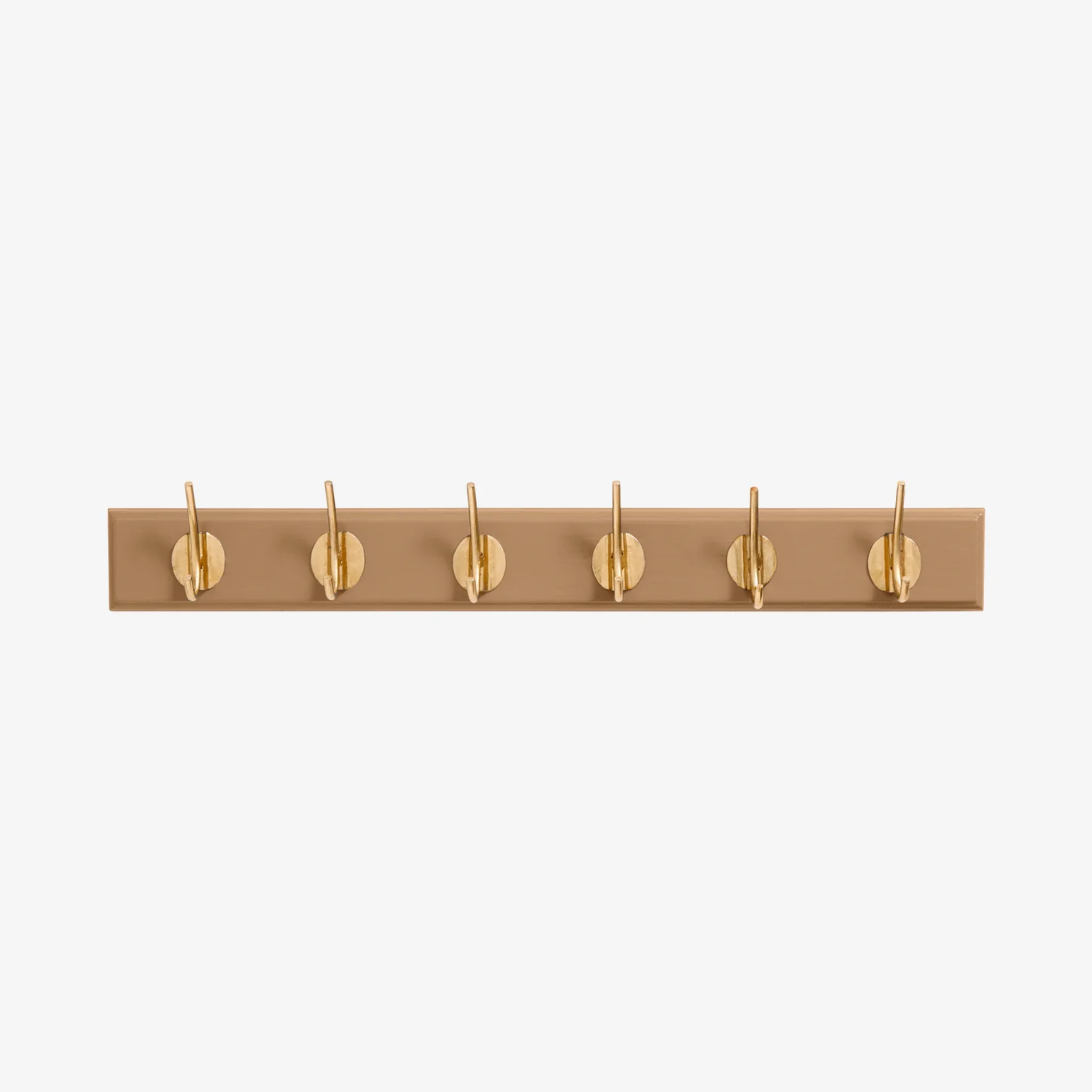Stilfuld og funktionel knagerække med solide kroge i jern, monteret på en mørkbrun eller lysebrun bund.