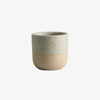 Grainy koppen i stentøj kombinerer en blød form med en rolig, sandfarvet glasur og en rå bund, hvilket skaber et naturligt og moderne udtryk.