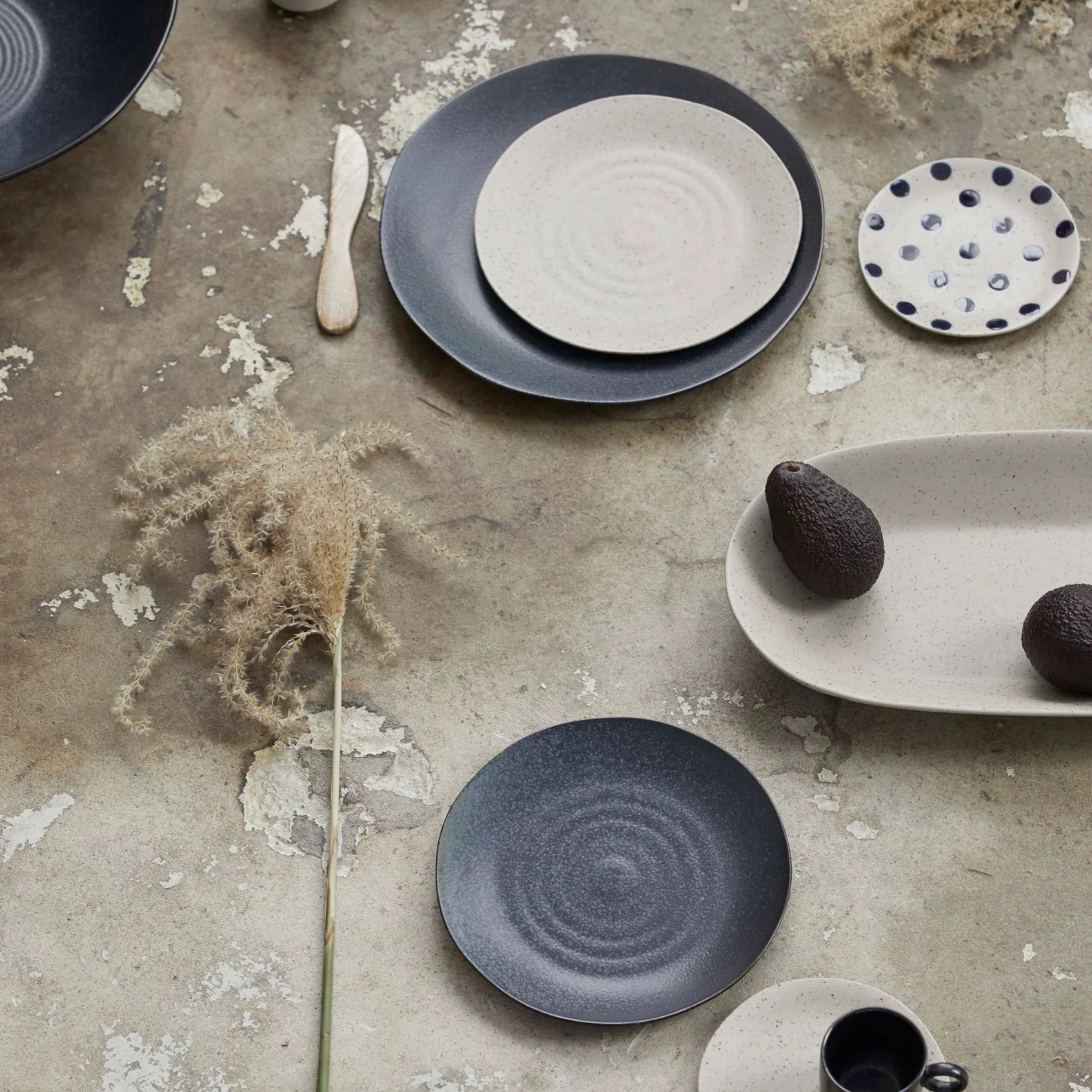Grainy serveringsfad er en del af et funktionelt og moderne stel i keramik med et smukt rustikt udtryk. Fadet har en delvis mat glasering og et enkelt formsprog, der gør det velegnet til både hverdag og festlige lejligheder.