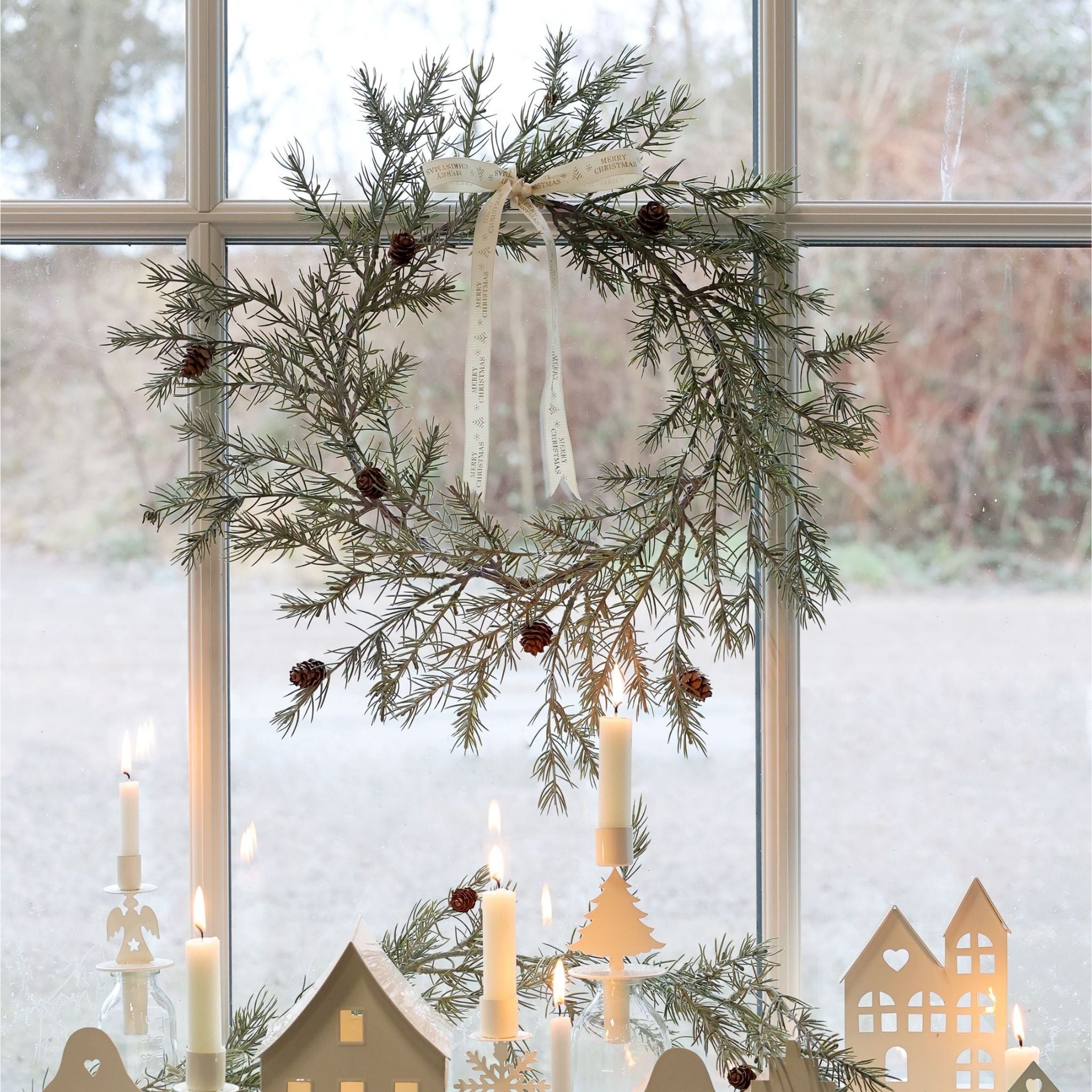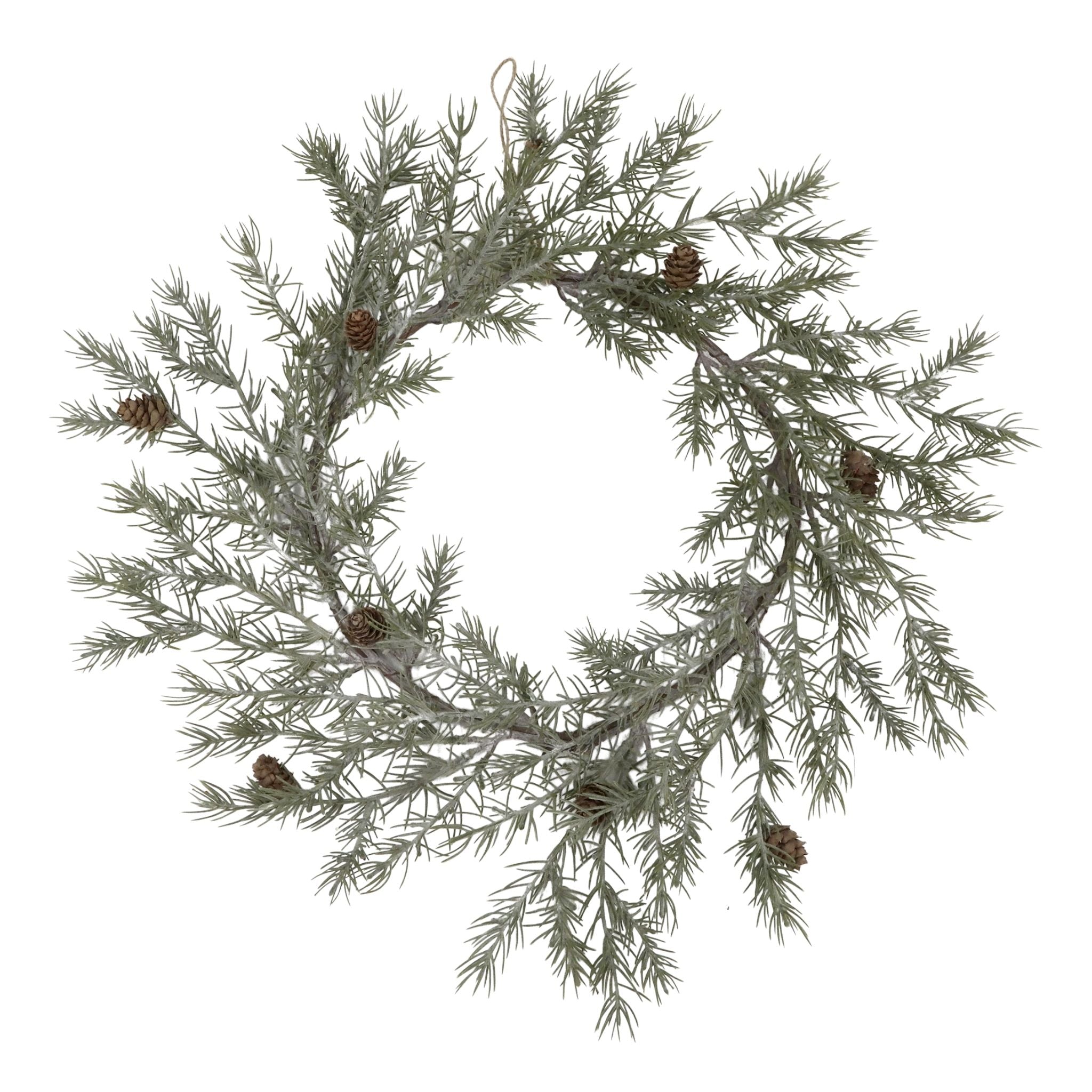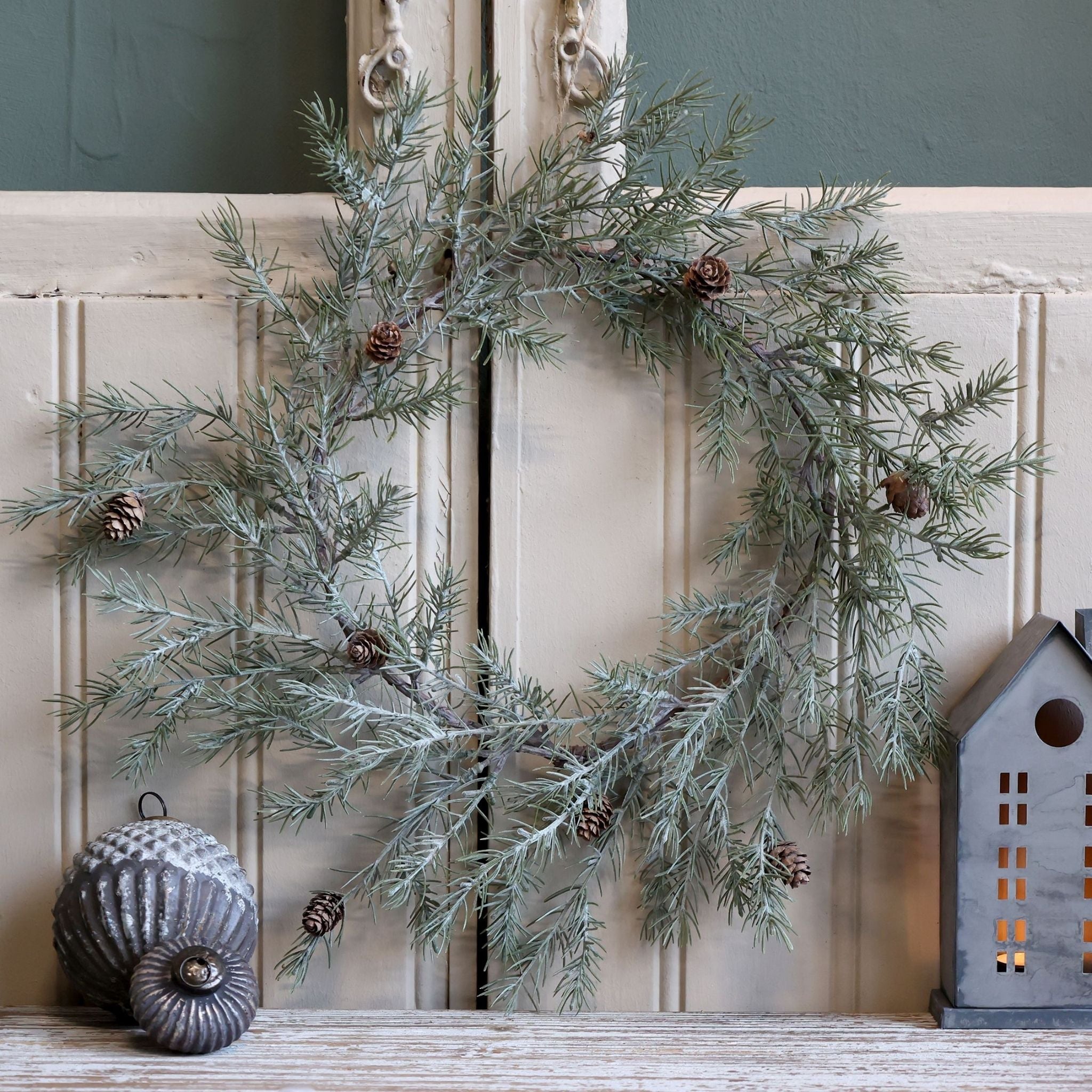 Skab en hyggelig julestemning med denne fine kunstige krans med gran fra Chic Antique. Kransen er pyntet med kogler og kan bruges til dine juledekorationer.