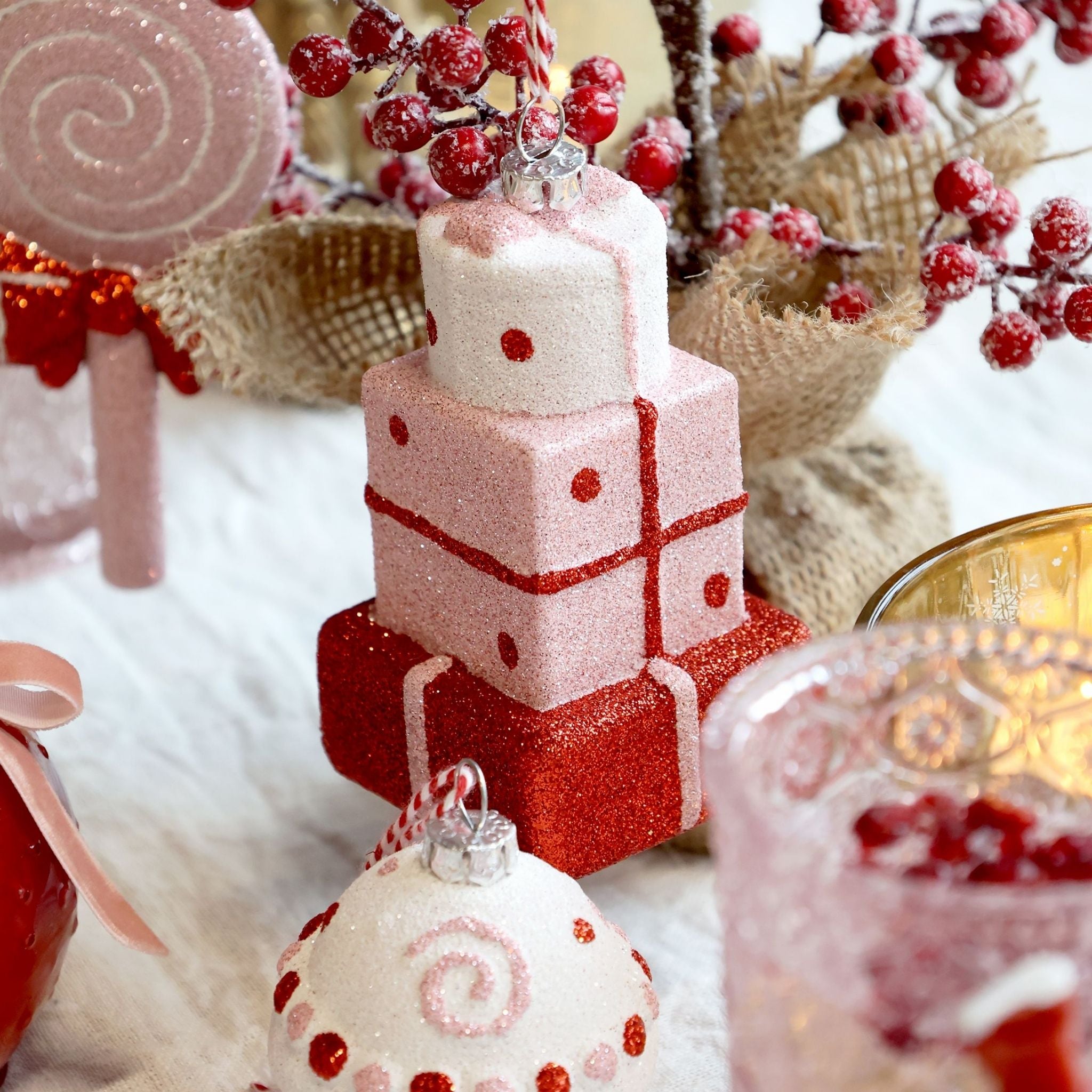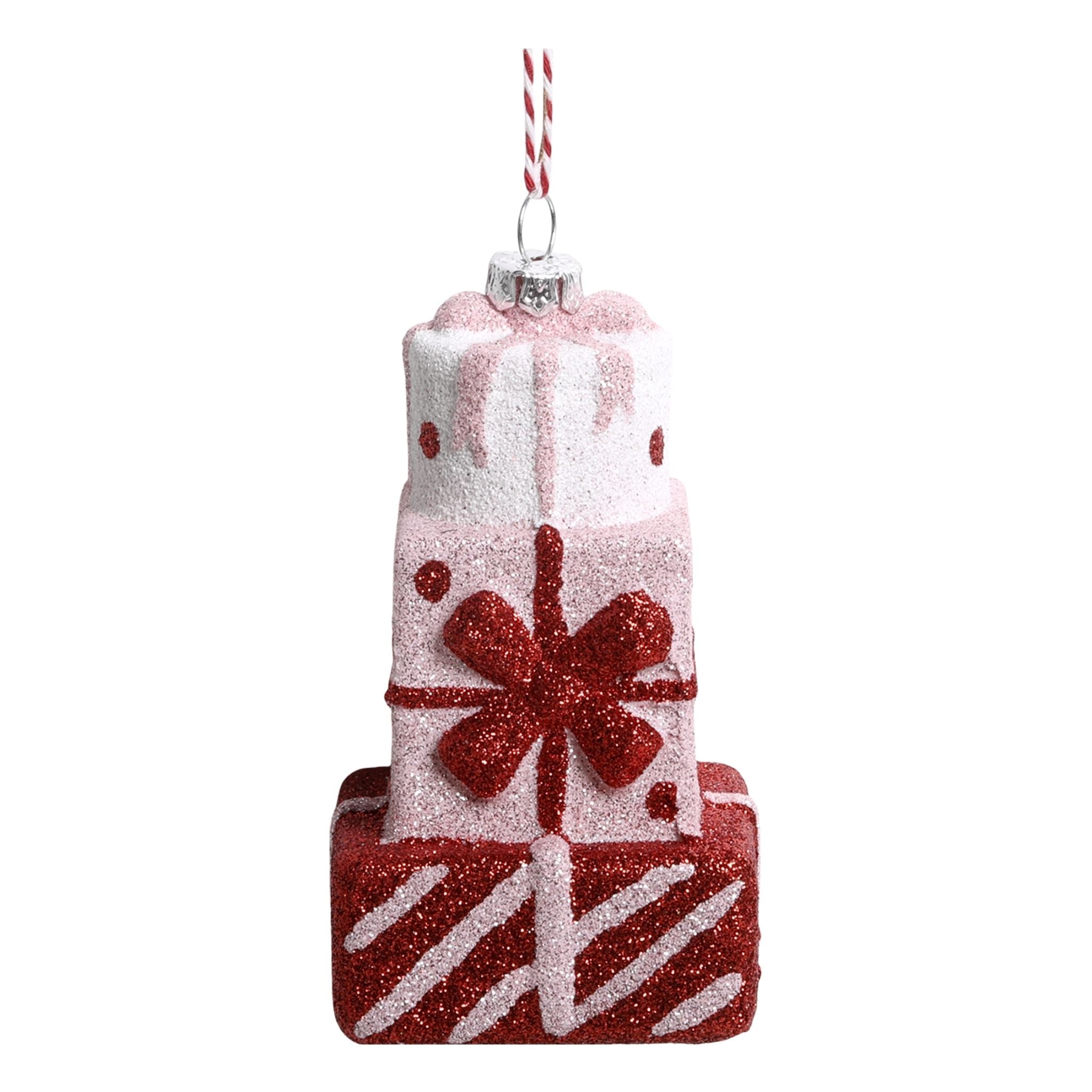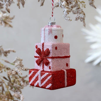 Fineste julekugle fra Chic Antique der forestiller 3 pakker ovenpå hinanden i flotte lyserøde og røde nuancer. Kuglen er håndmalet og med masser af glimmer på.