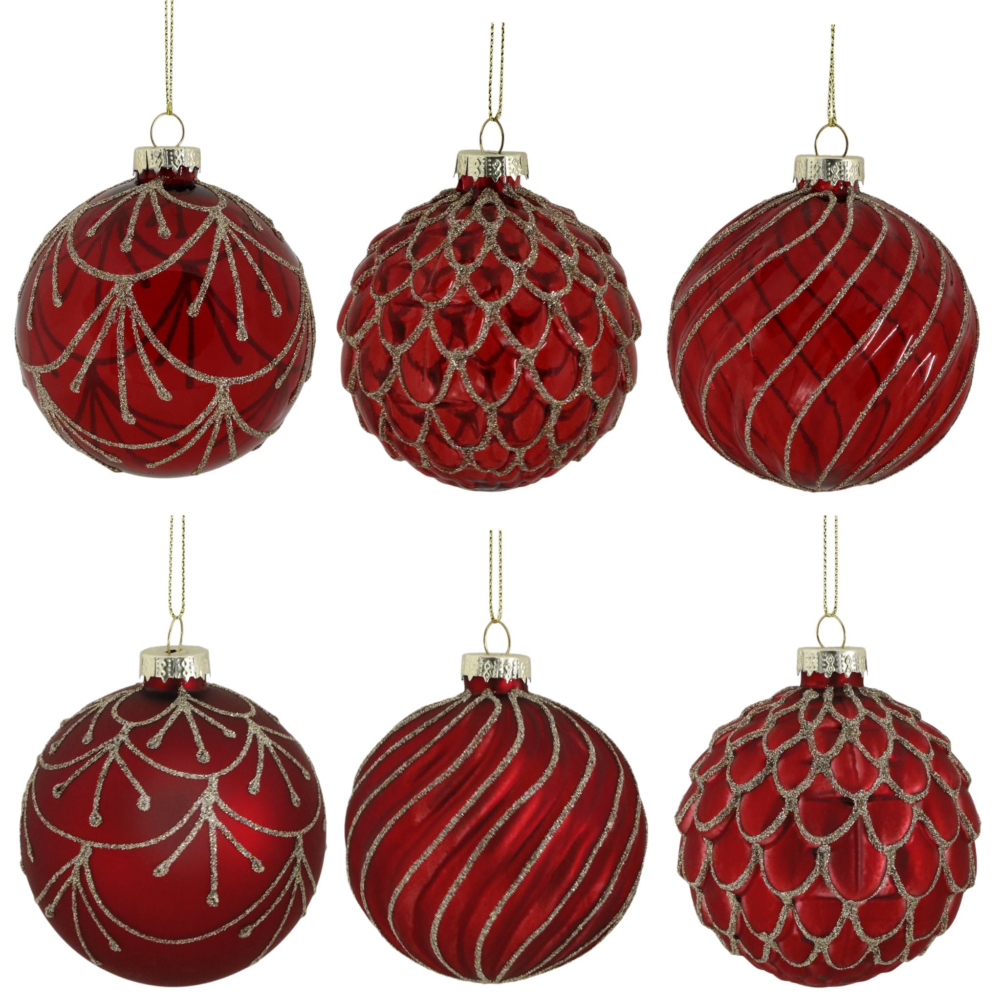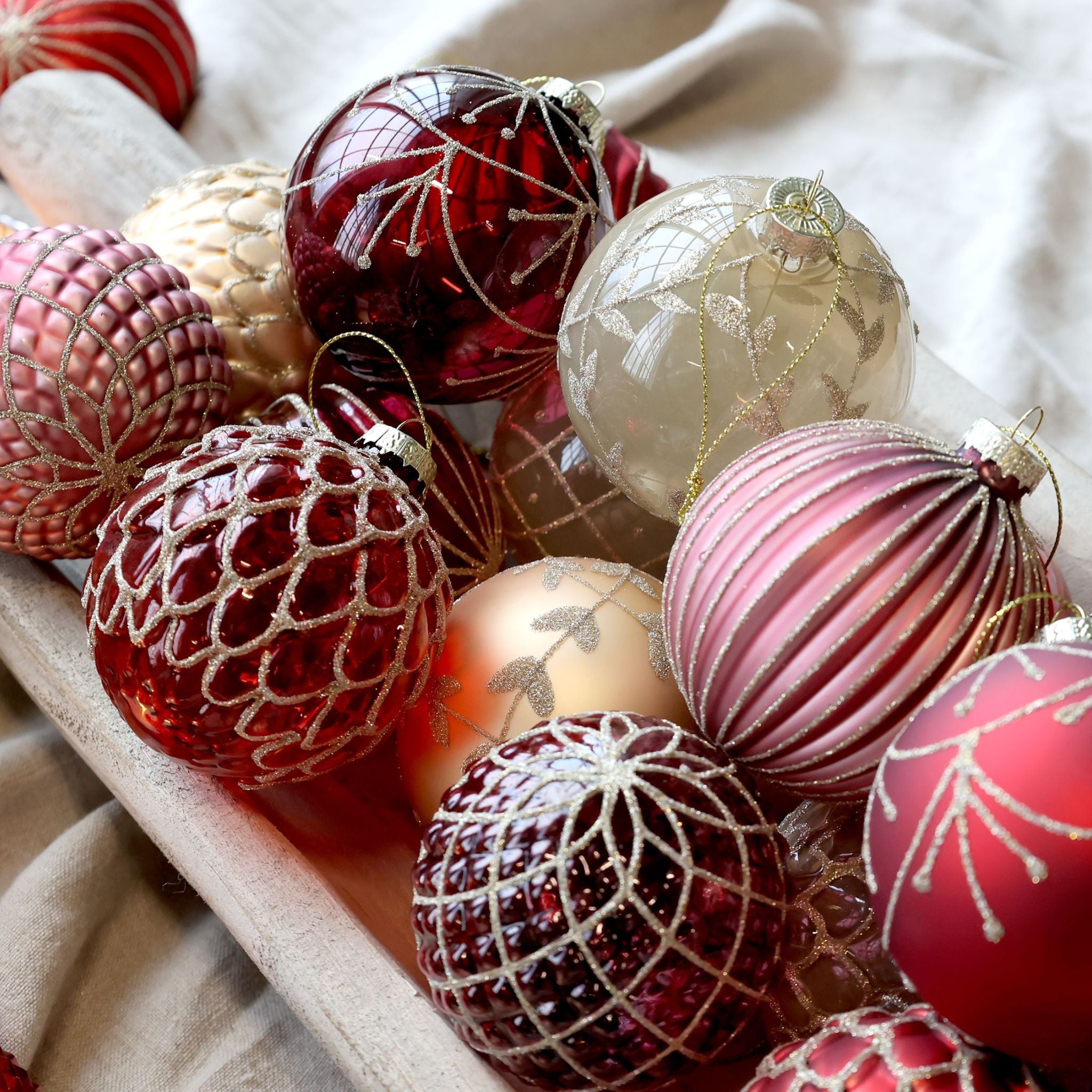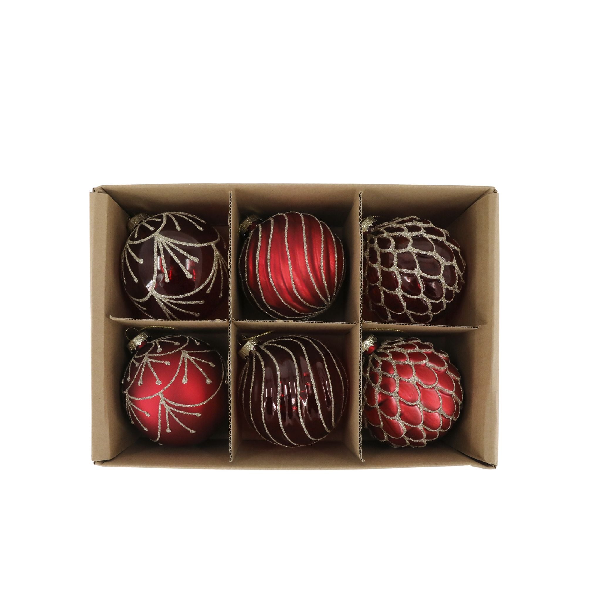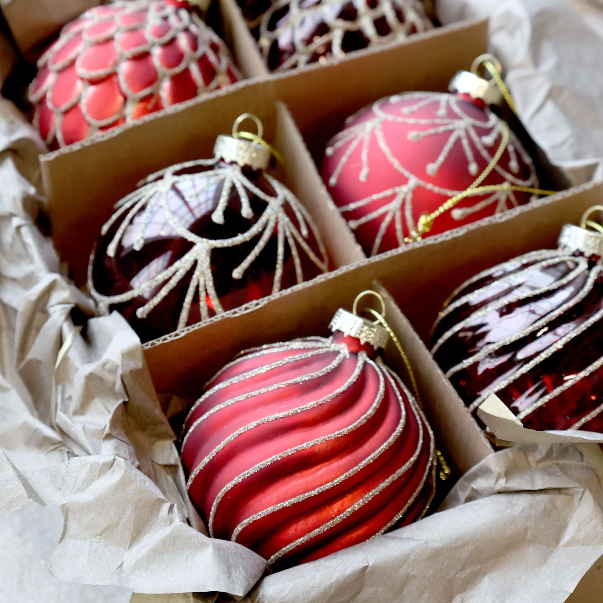 Æske med 6 stk julekugler i en skøn cherry farve som er en klassisk julerød. Julekuglerne kommer med forskellige motiver og glimmer detaljer. Nogle af dem er transparente og andre er ikke, hvilket giver dem forskellige udtryk samtidig med at de stadig passer godt til hinanden.