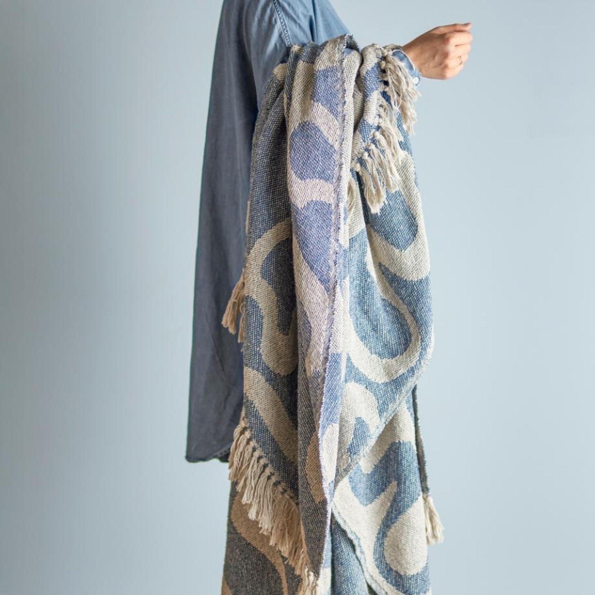 Plaiden er vævet af genanvendt bomuld og har et kunstnerisk mønster i rustrøde og beige eller blå og beige nuancer.