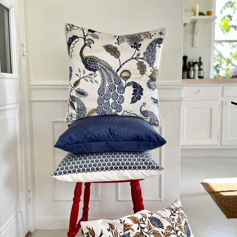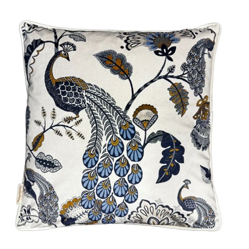 Tilføj et strejf af elegance og blå charme til din indretning med dette smukke velour pyntepude betræk. Forsiden prydes af et flot påfugle motiv i skønne blå nuancer, mens bagsiden af en creme farvet velour. Betrækket har en størrelse på 50x50 cm og du kan bruge pyntepuder til at dekorere stuen eller soveværelset.