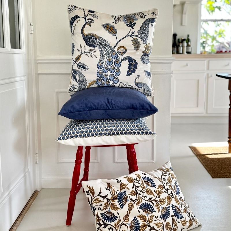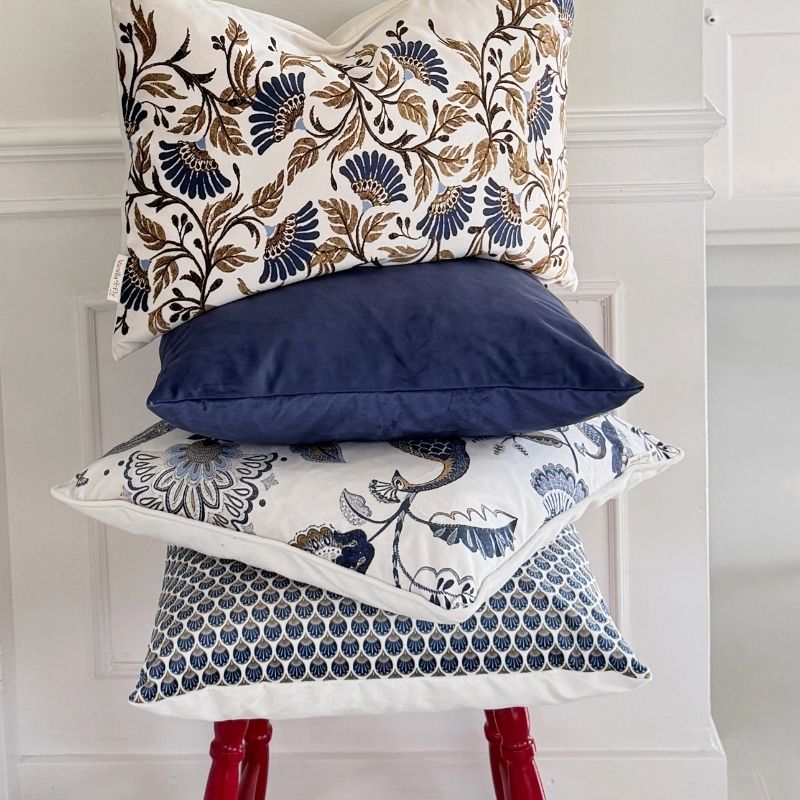 Pudebetræk i blød velour med smukke blå nuancer, der tilfører rummet et strejf af elegance og ro. Den luksuriøse overflade giver en følelse af hverdagsluksus og gør det nemt at forny indretningen uden store ændringer.