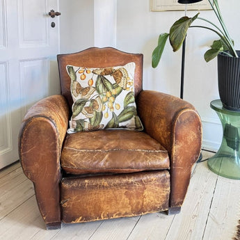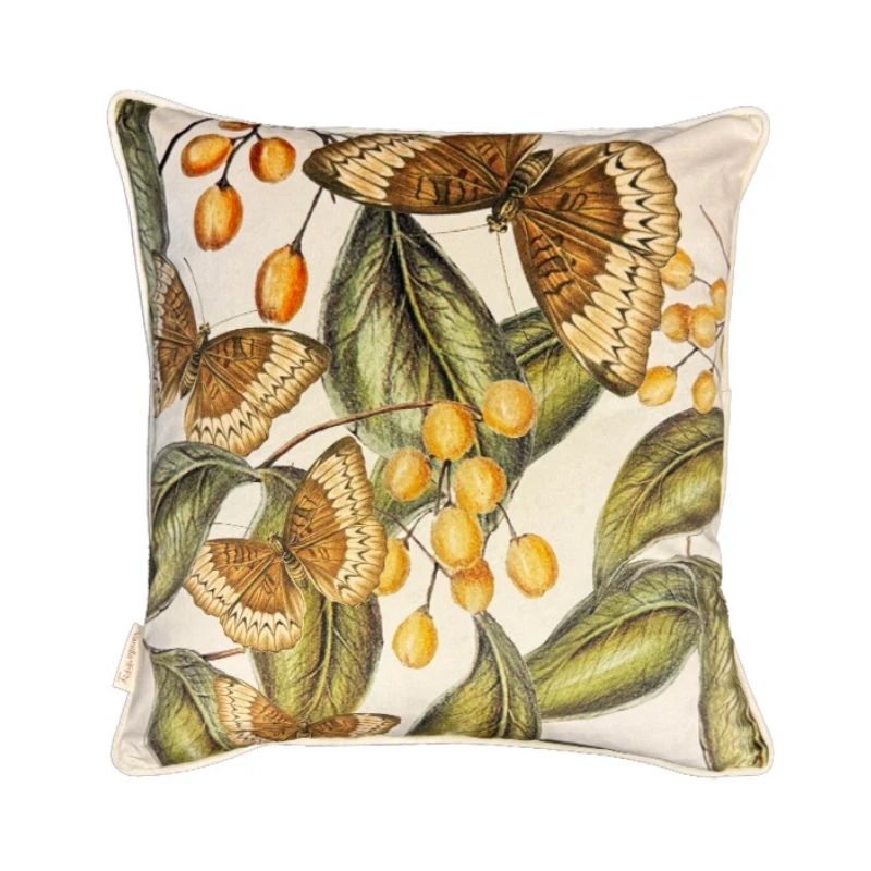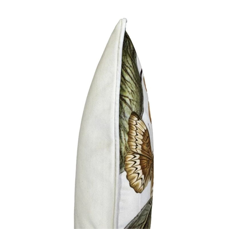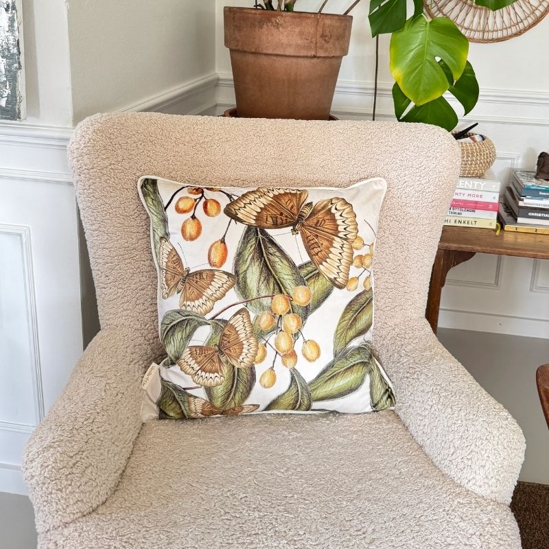 Pudebetræk i blød velour med et smukt motiv af sommerfugle og grene samt en elegant bagside i cremefarvet velour. Den luksuriøse tekstur og de fine detaljer skaber en følelse af hverdagsluksus og tilføjer et strejf af naturinspiration til indretningen.