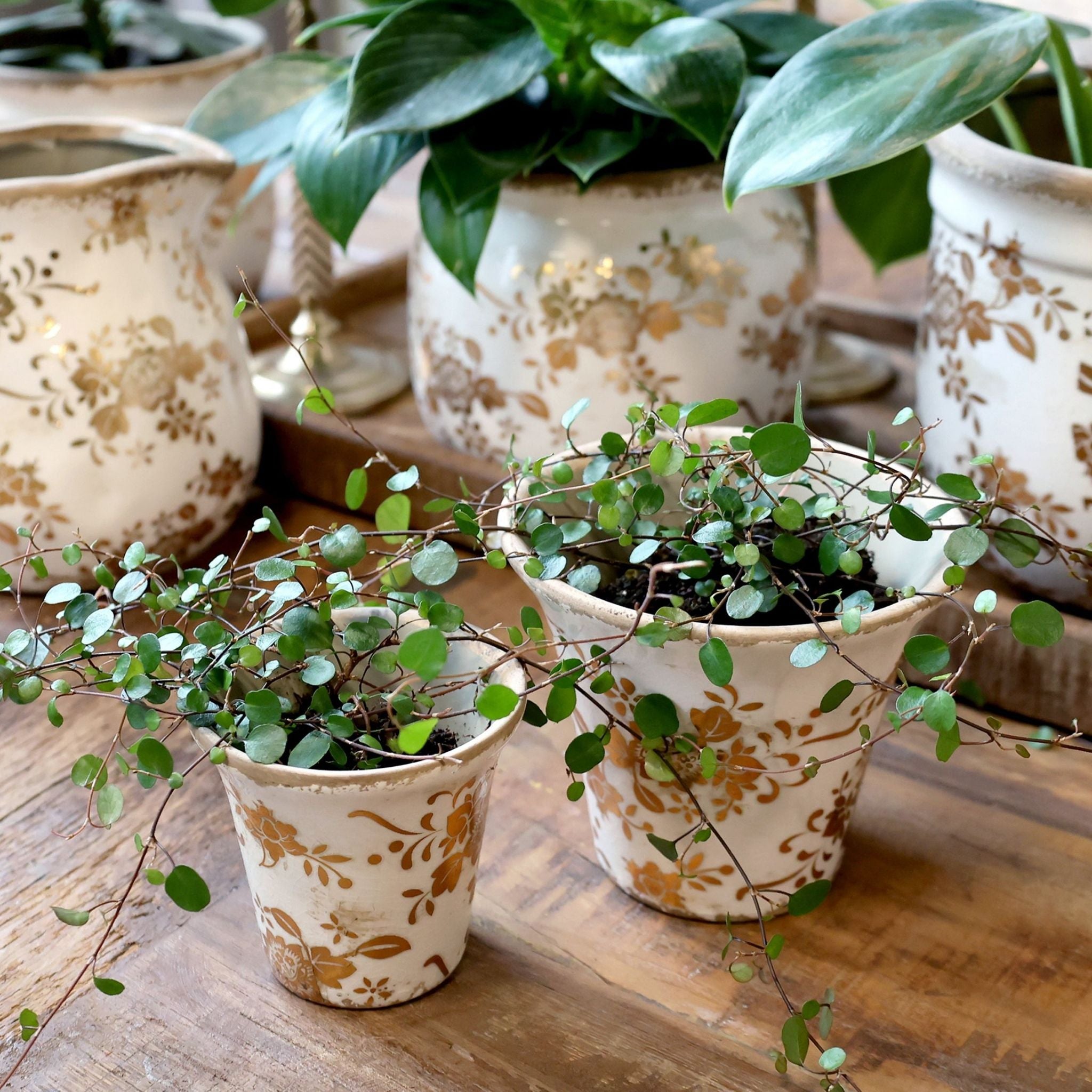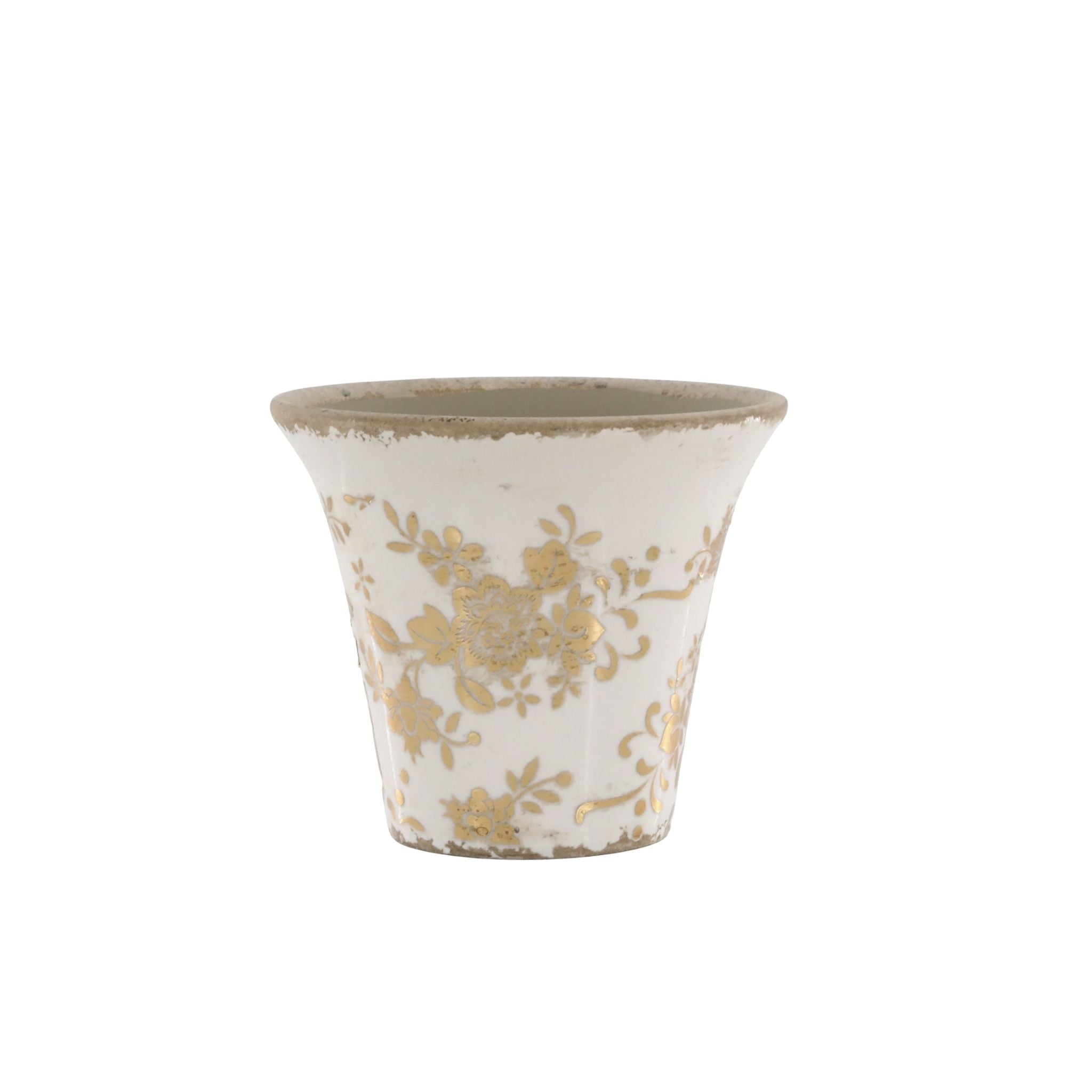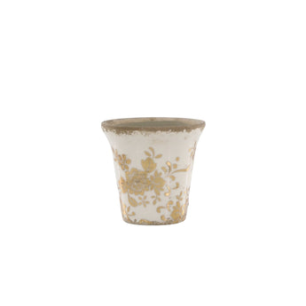 Tilføj et strejf af elegance til dit hjem med disse flotte urtepotteskjulere fra Chic Antiques jubilæums Melun-serie. Skjuleren er fremstillet i keramik og kommer i en flot creme farve med guldfarvet blomstermønster på.