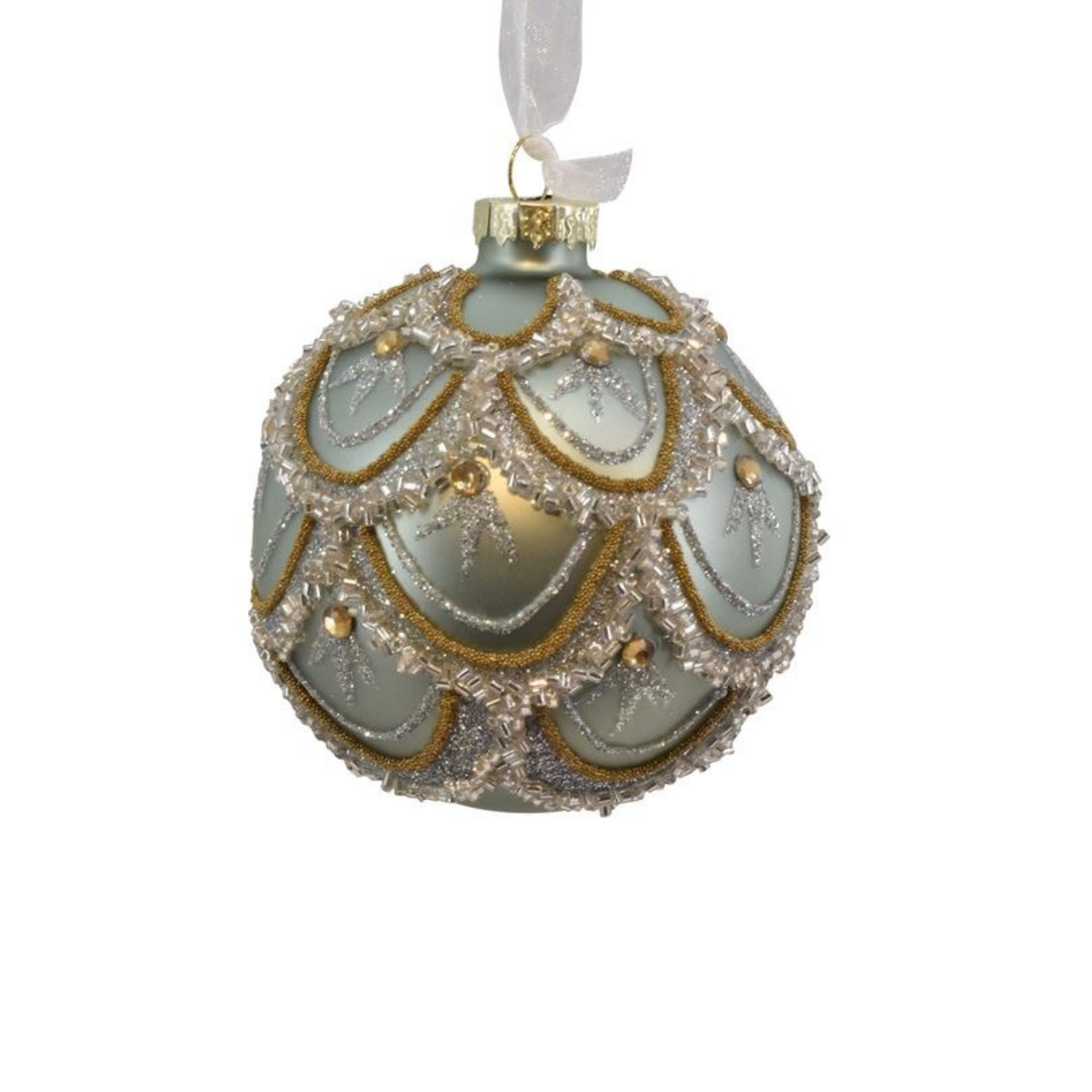 Den støv grønne glaskugle med glitter er en smuk og dekorativ julekugle til ophæng.