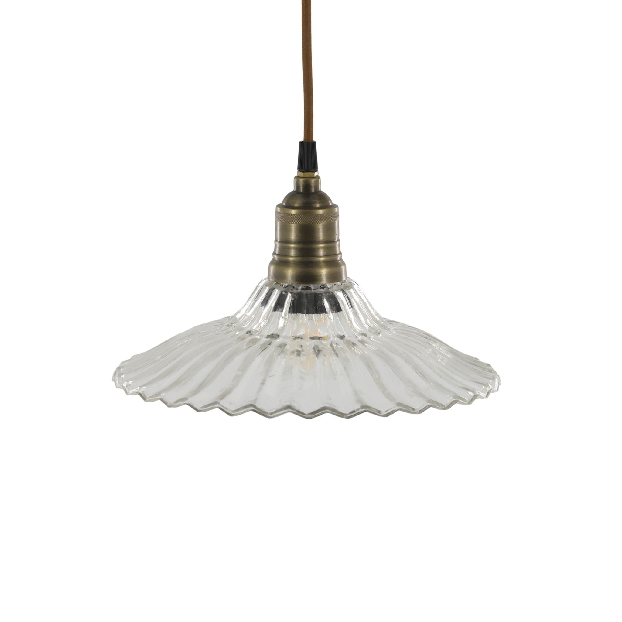 Denne yndige loftlampe forener klassisk elegance med et strejf af vintage charme. Lampen har en smuk og elegant klar glasskærm og en top i messing. Lampen passer perfekt over spisebordet, i entreen eller i det ene hjørne af stuen. Hæng en enkelt lampe op for et enkelt og elegant udtryk, eller kombiner med flere lamper for at skabe en harmonisk og personligt udtryk i din indretning.