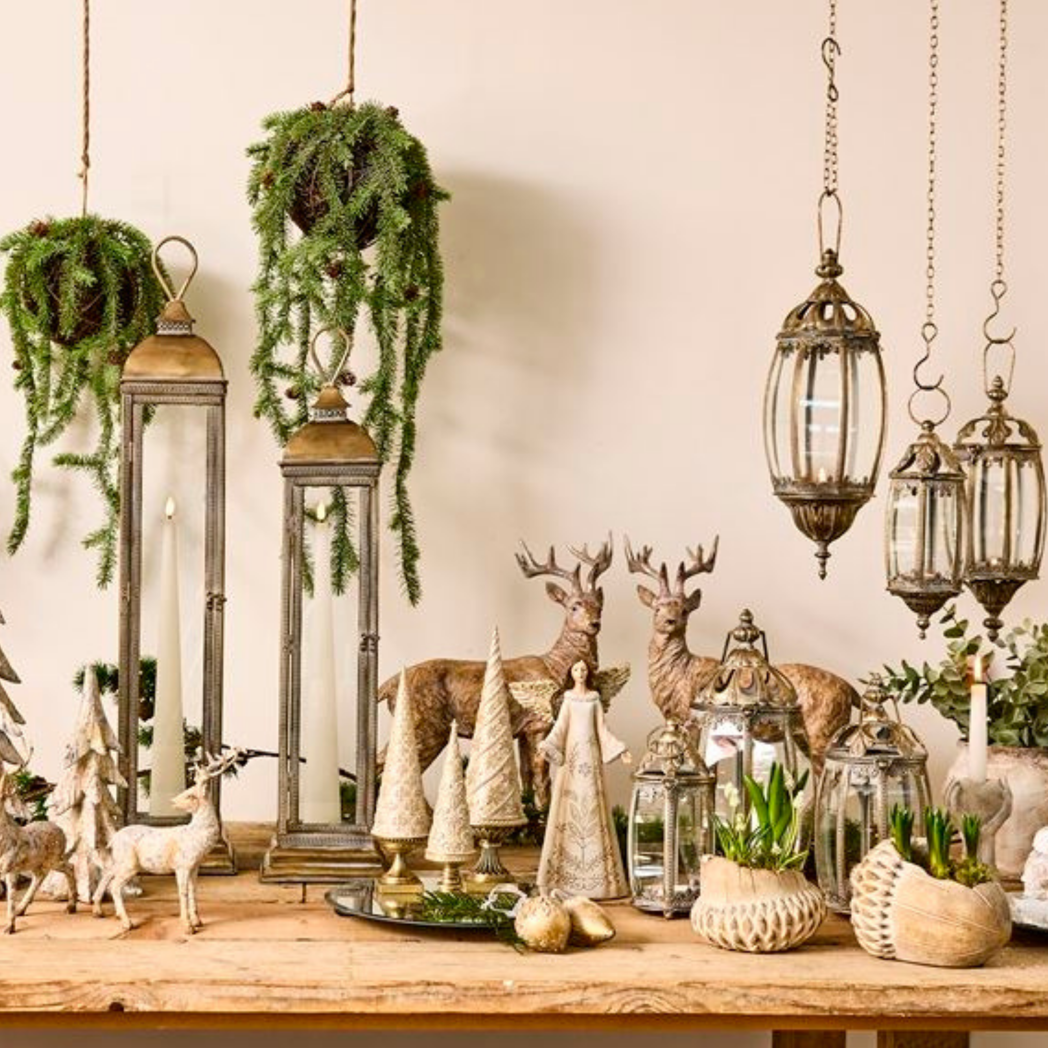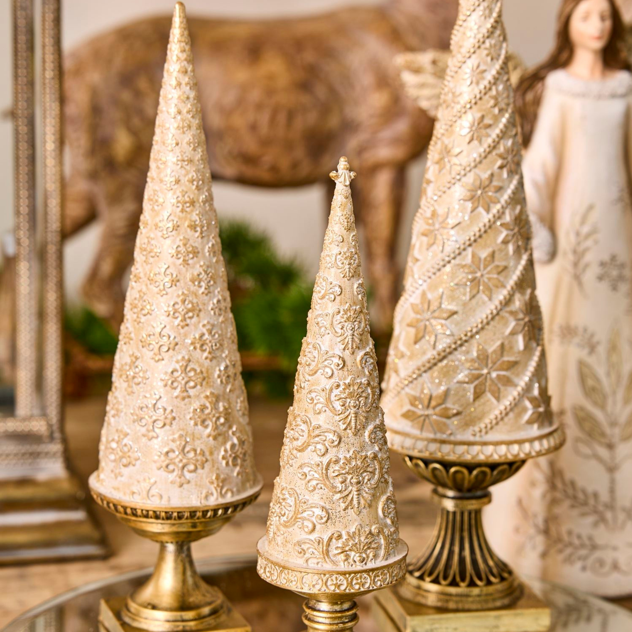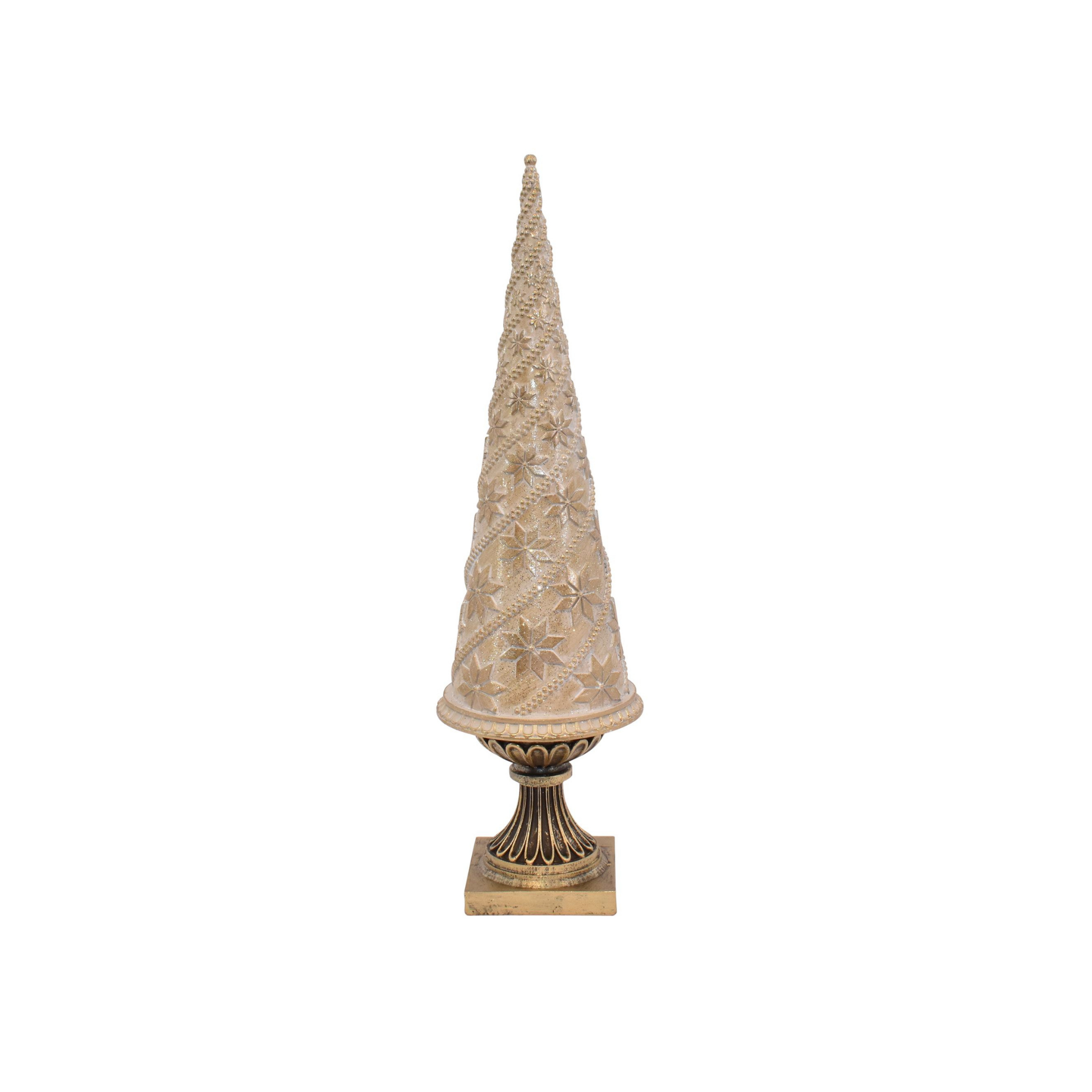 Fint gylden træ i polyresin med fod som er en stilfuld juledekoration, der fås i tre størrelser.