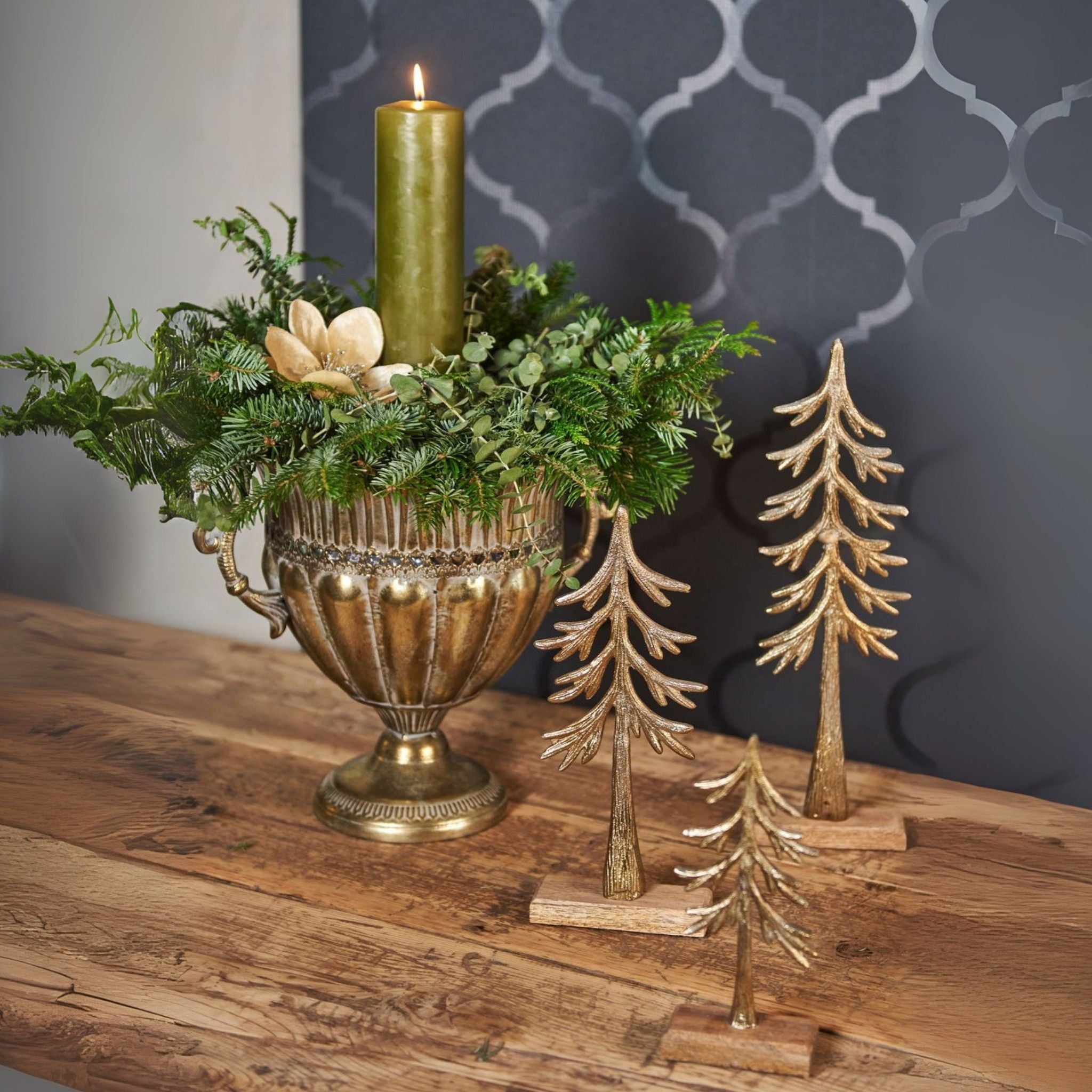 Skab klassisk julestemning med dette juletræ i antik guld på en stabil træfod. Træet fås i tre størrelser og passer perfekt ind i både små og store rum, hvor det spreder varme og hygge med sit elegante og tidløse design.