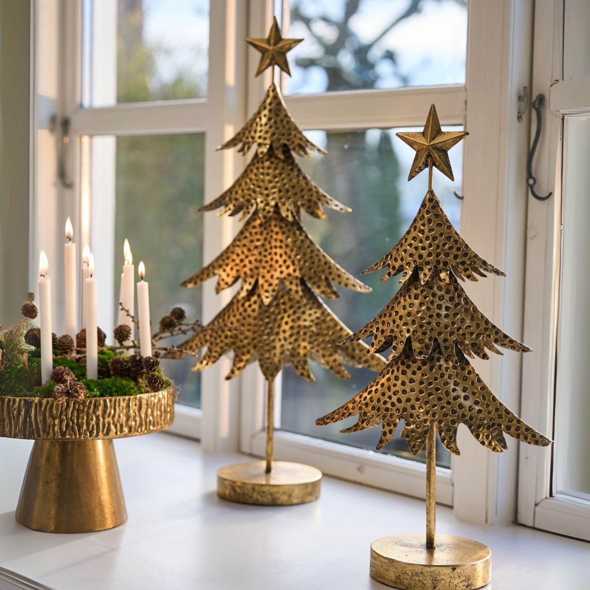 Skab et elegant og festligt fokuspunkt med dette juletræ i metal i antik guld med smuk topstjerne. Træet fås i to størrelser, så du kan vælge den perfekte variant til dit hjem og tilføje et tidløst juleudtryk.