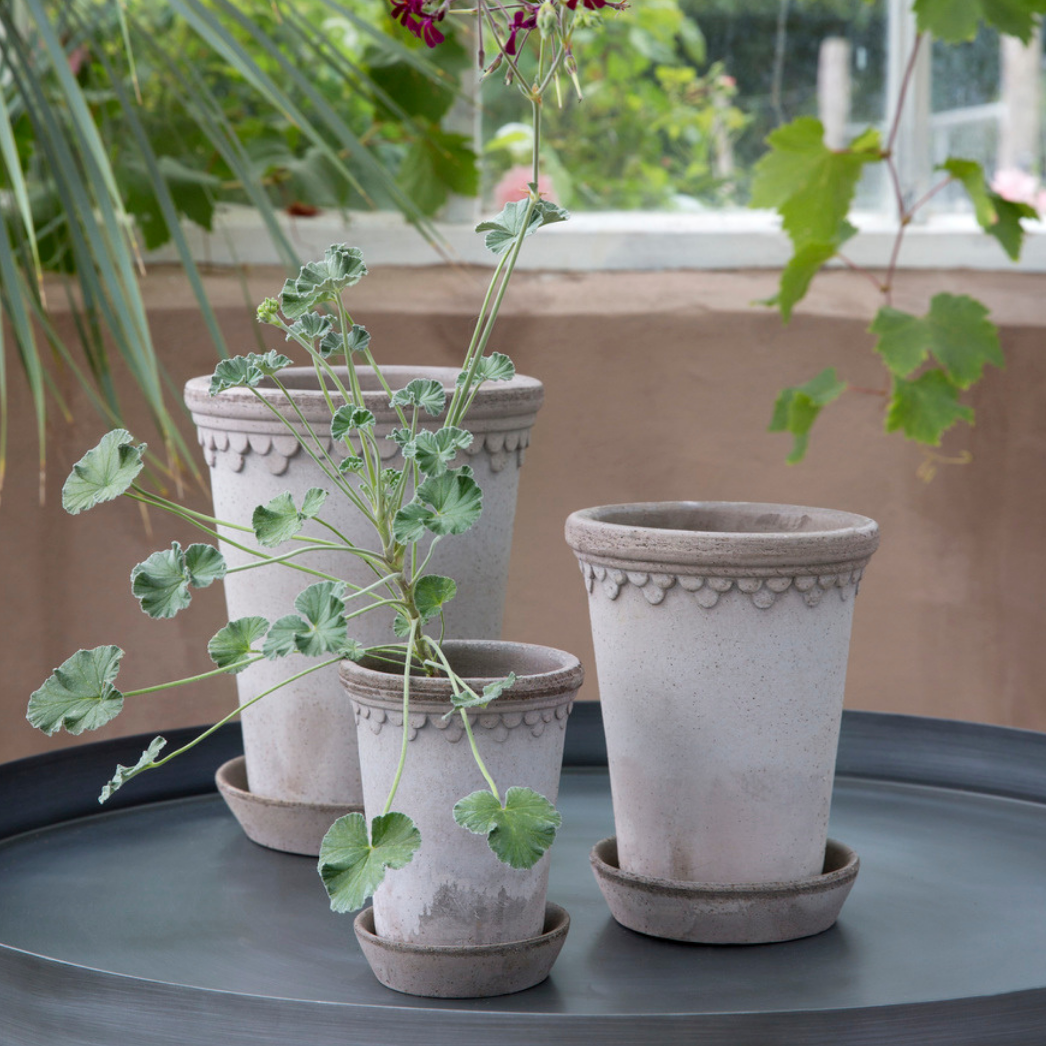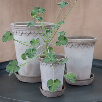 Flotte blomster potter fra Bergs Potter i kvalitets ler fra Italien. Krukkerne kan stå både inde og ude, da leret er frostsikret. Potterne er ikke glaseret, men vil kun blive flottere og få mere patina med tiden. Der medfølger en fin underskål til potten.