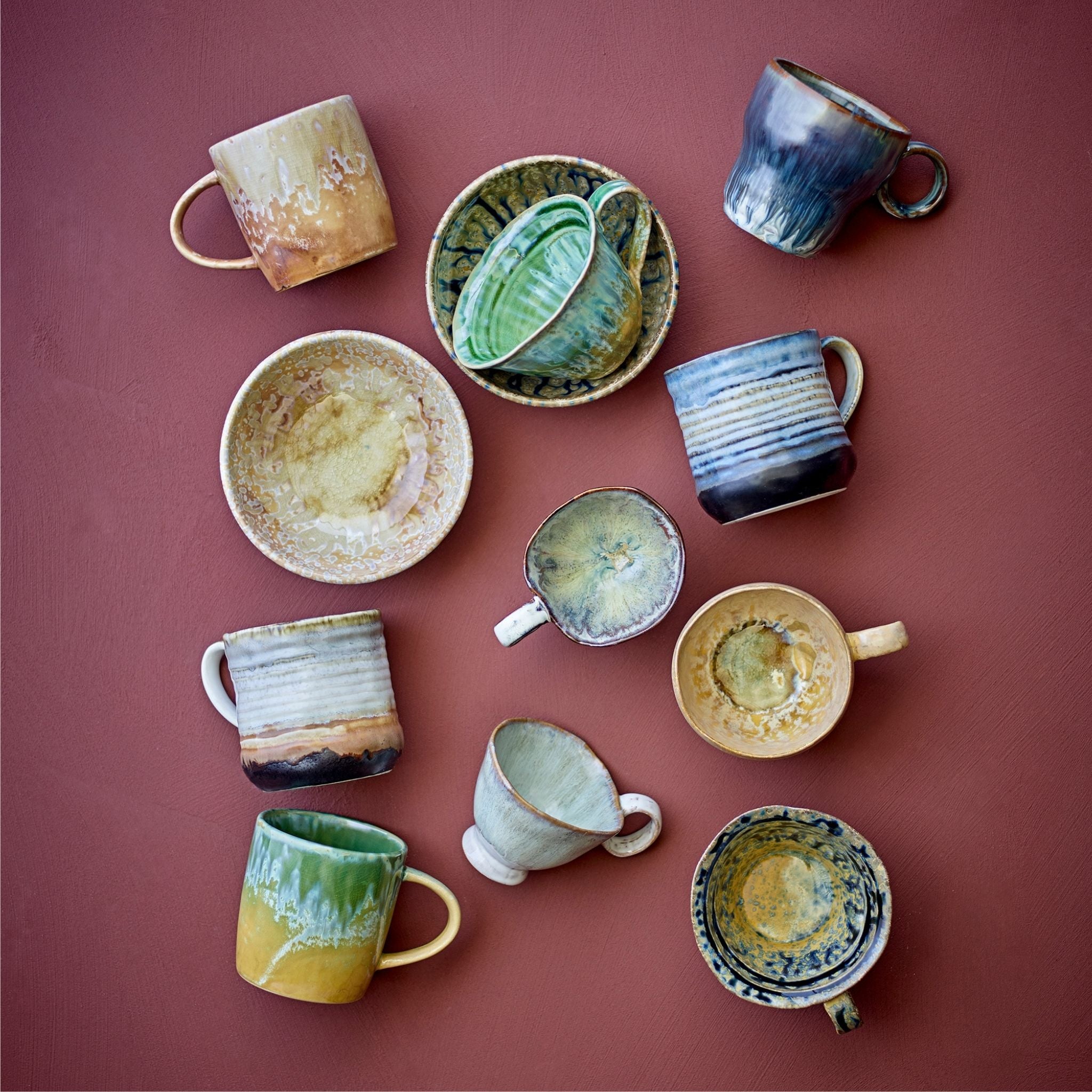 Milani Koppen er fremstillet i en blød grøn tone med en glasur, der giver et unikt og charmerende farvespil. Hver kop har sin egen unikke finish, hvilket gør den til et særligt og personligt element på dit bord.