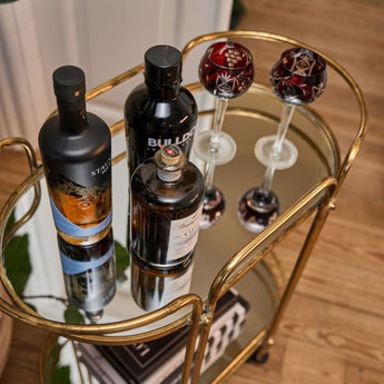 Tilføj både funktion og elegance til dit hjem med dette stilfulde rullebord i antik guld.