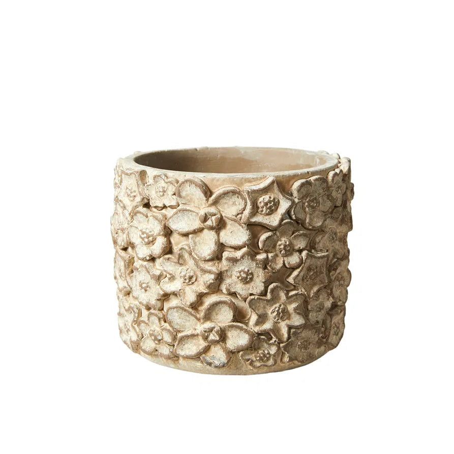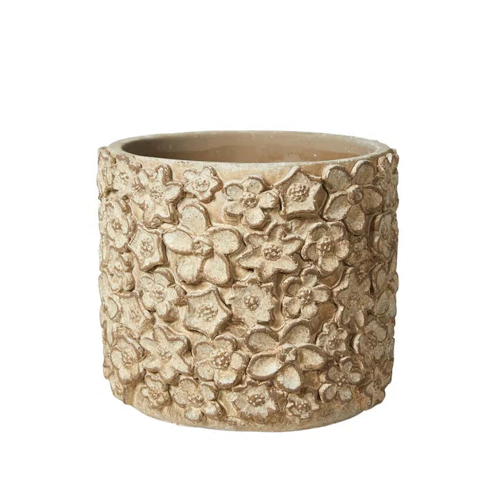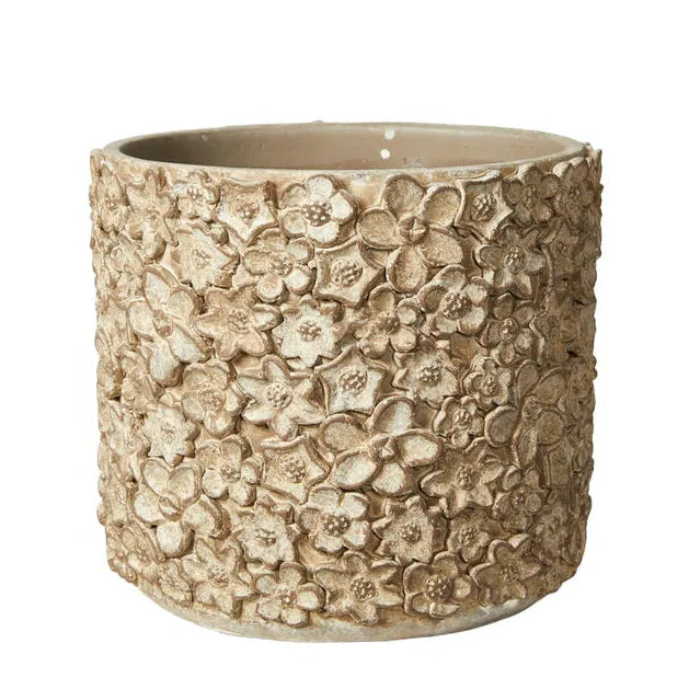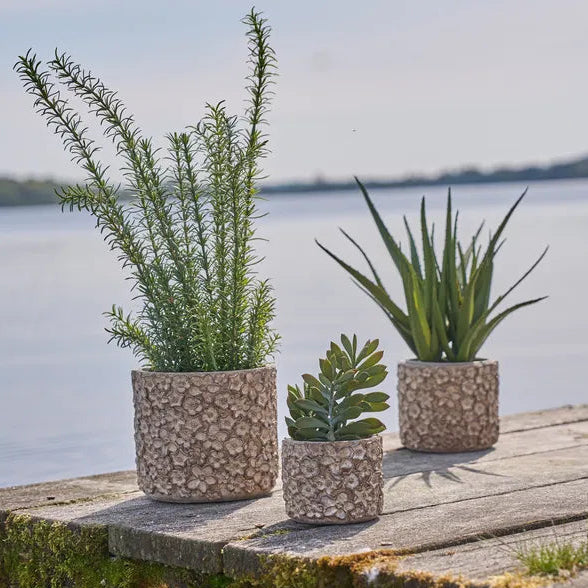 Behandlet med vandafvisende maling, men cement er ikke 100% vandtæt. Brug inderskål og placer på beskyttet overflade. Leveres med filtdupper.