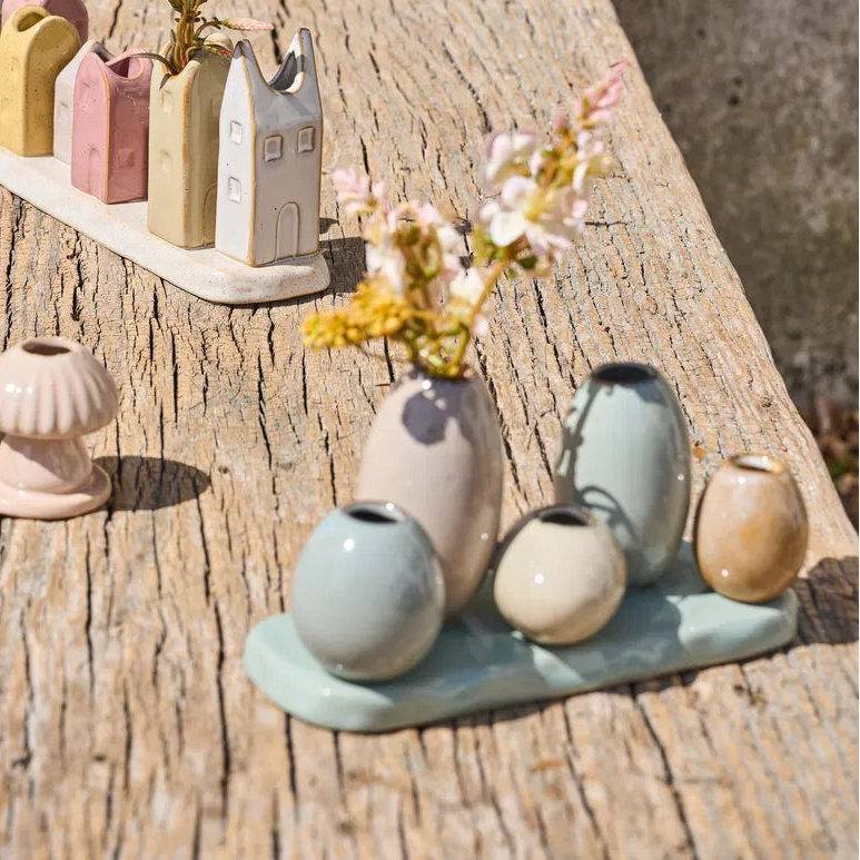 Forskellige små vaser samlet i ét produkt. Pyntes nemt med eksempelvis naturtro blomster for et vedvarende blomstrende udtryk.
