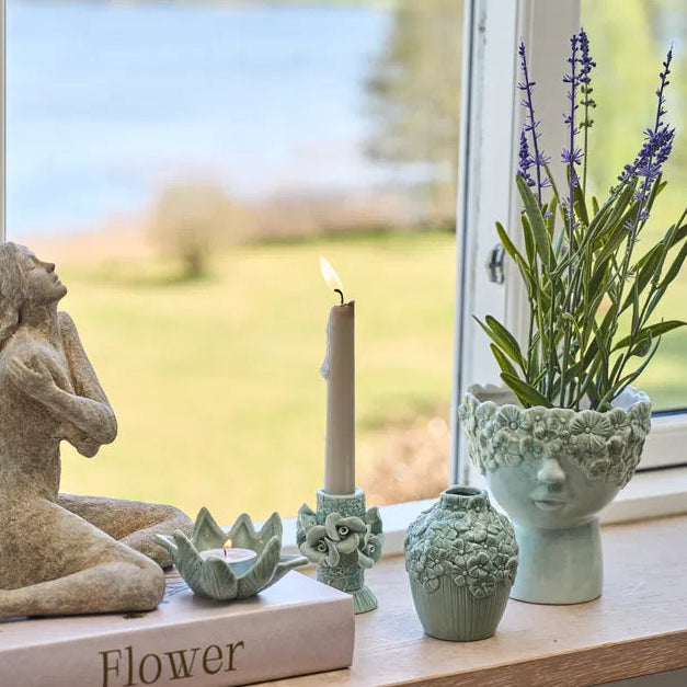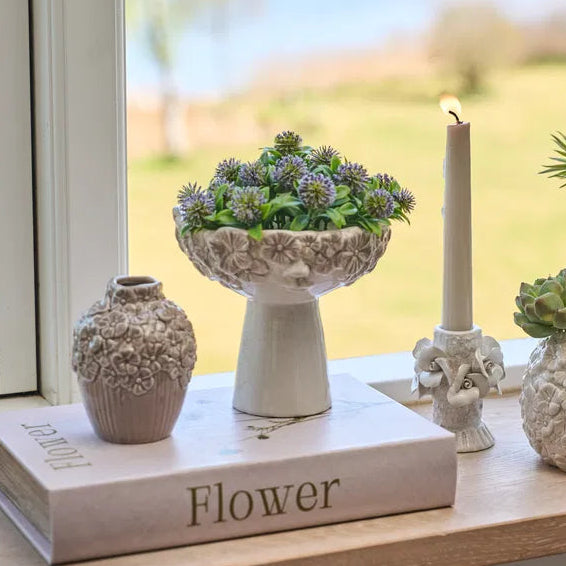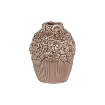 Smuk håndmalet keramikvase med blomster i toppen med rillede detaljer forneden, denne sammensætning skaber et elegant og kunstnerisk udtryk.
